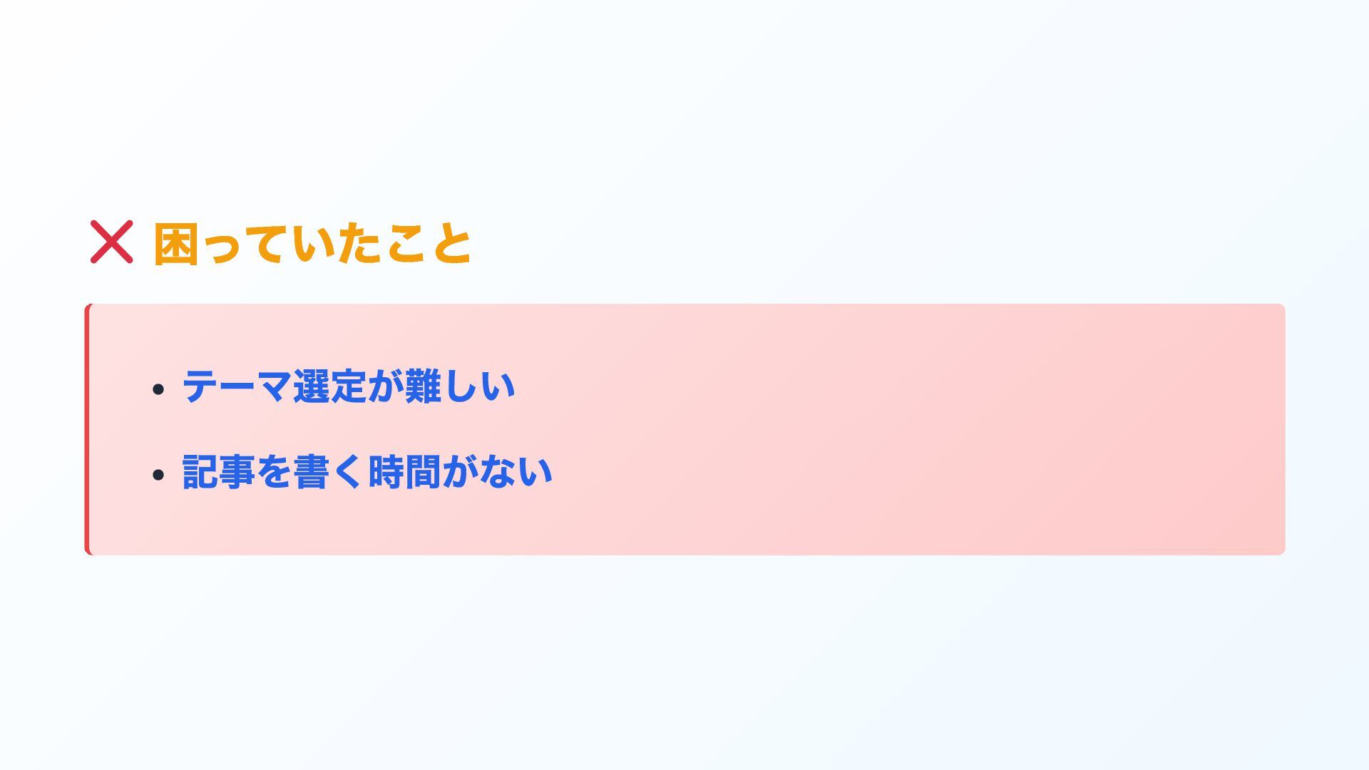 困っていたこと テーマ選定が難しい 記事を書く時間がない