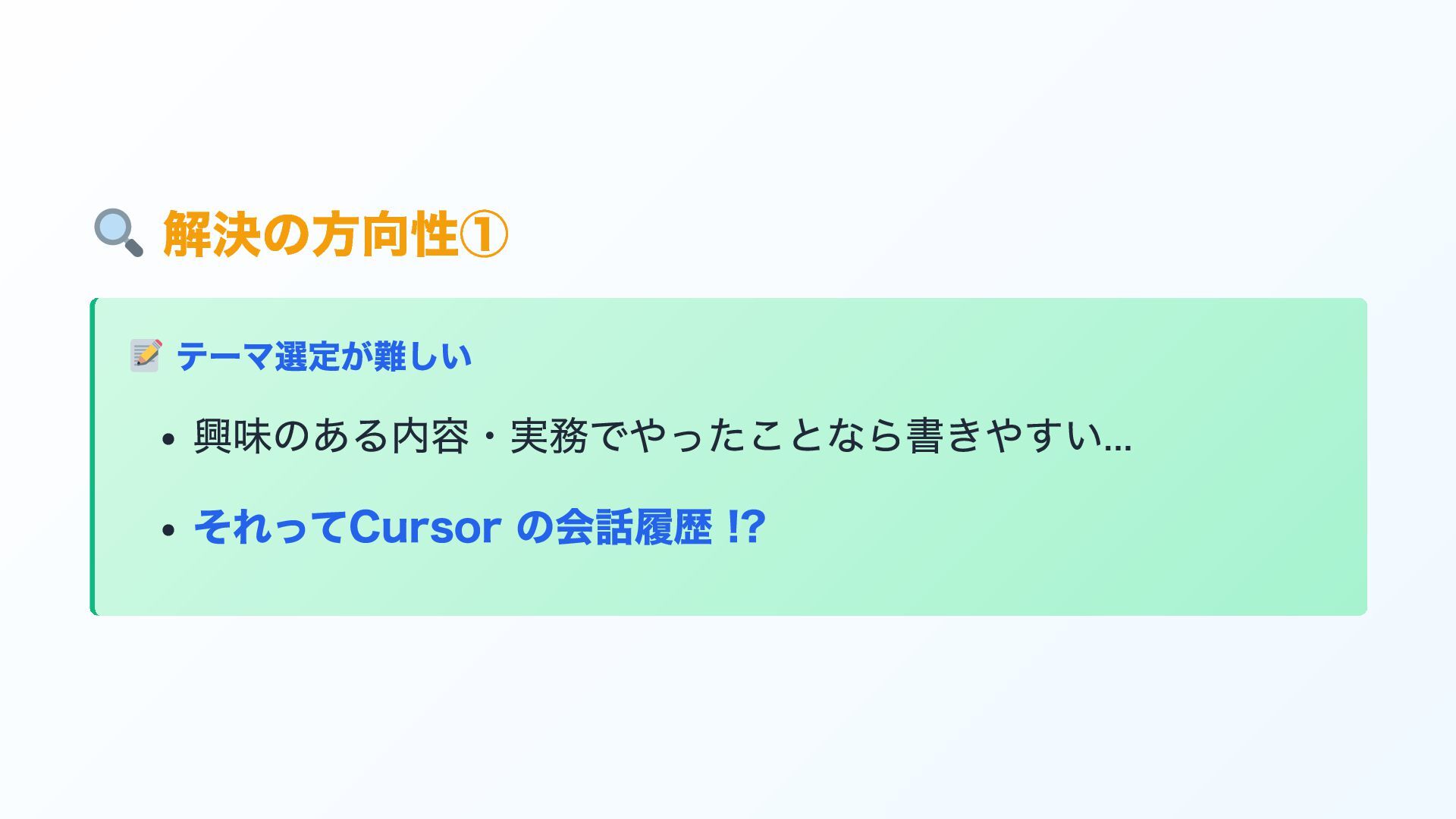 解決の方向性① テーマ選定が難しい 興味のある内容・実務でやったことなら書きやすい... それってCursor の会話履歴 !?