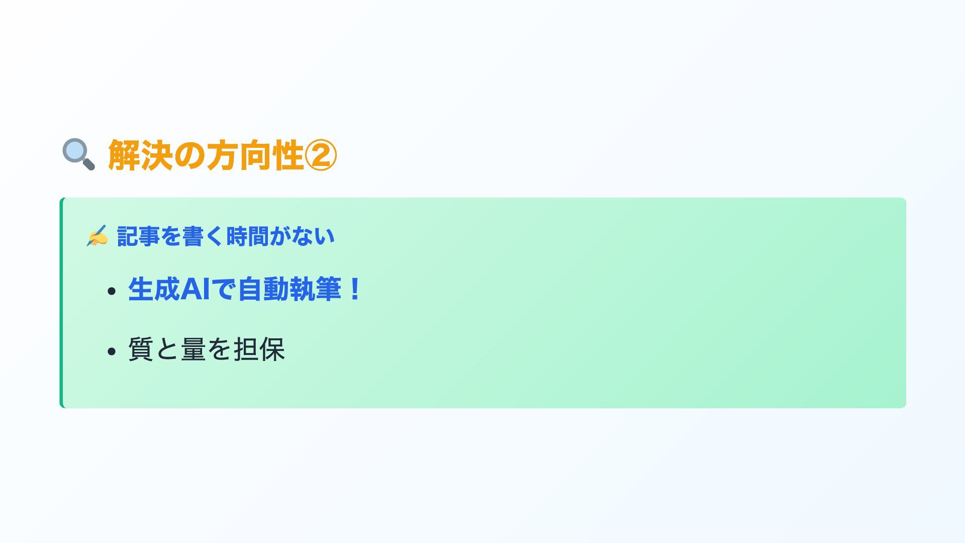 解決の方向性② 記事を書く時間がない 生成AIで自動執筆! 質と量を担保