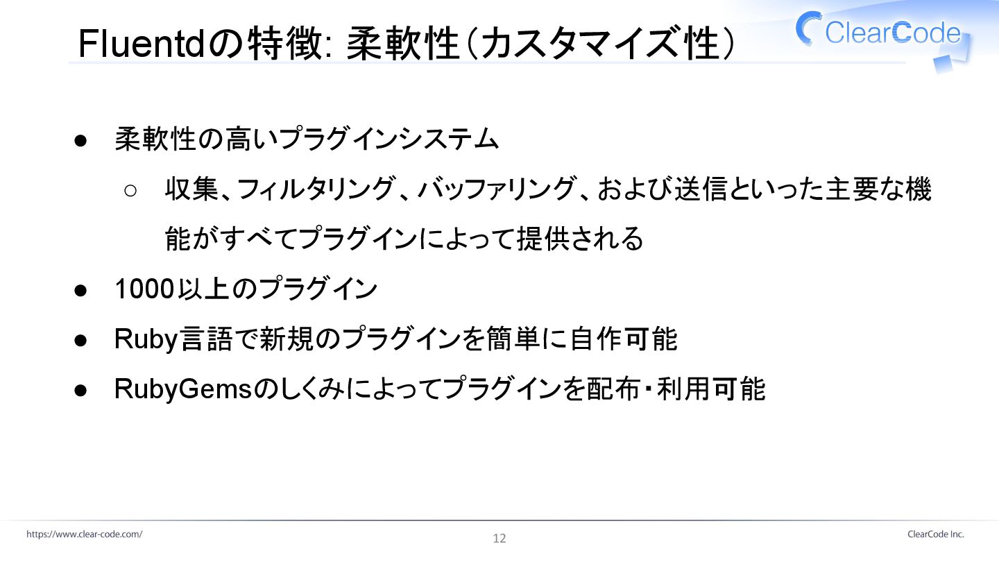 Fluentdの特徴: 柔軟性(カスタマイズ性) • 柔軟性の高いプラグインシステム ◦ 収集、フィルタリング、バッファリング、および送信といった主要な機 能がすべてプラグインによって提供される • 1000以上のプラグイン •