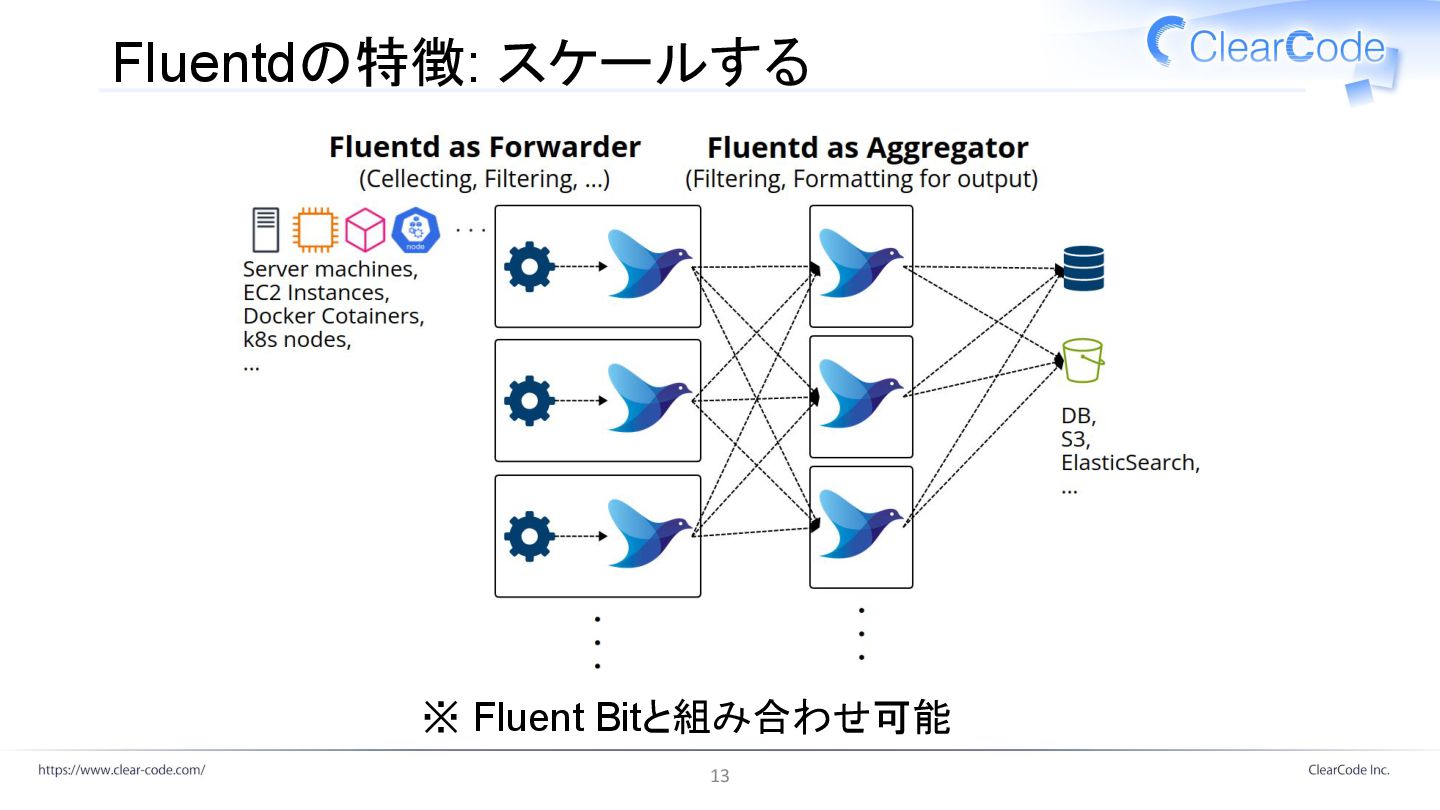 Fluentdの特徴: スケールする ※ Fluent Bitと組み合わせ可能 13