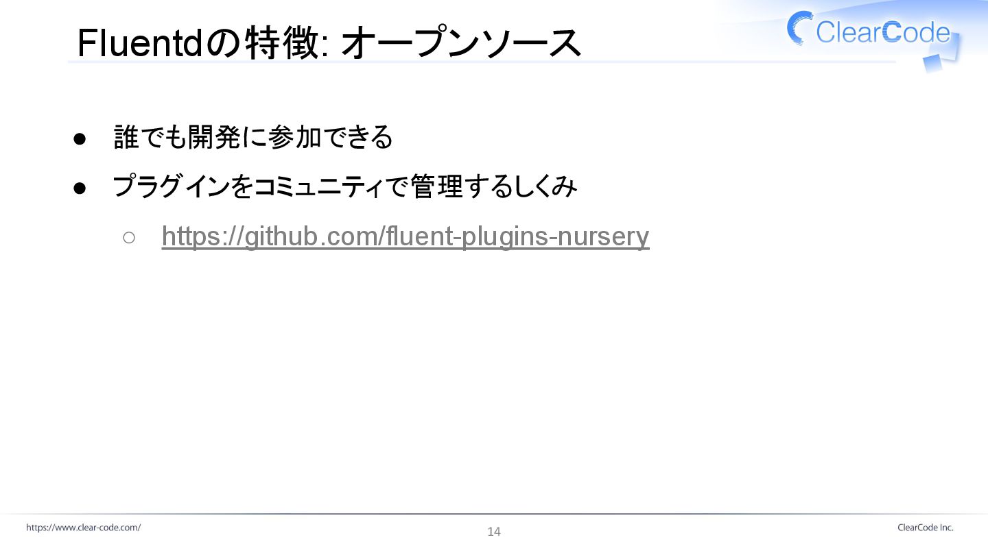 Fluentdの特徴: オープンソース • 誰でも開発に参加できる • プラグインをコミュニティで管理するしくみ ◦ https://github.com/fluent-plugins-nursery 14