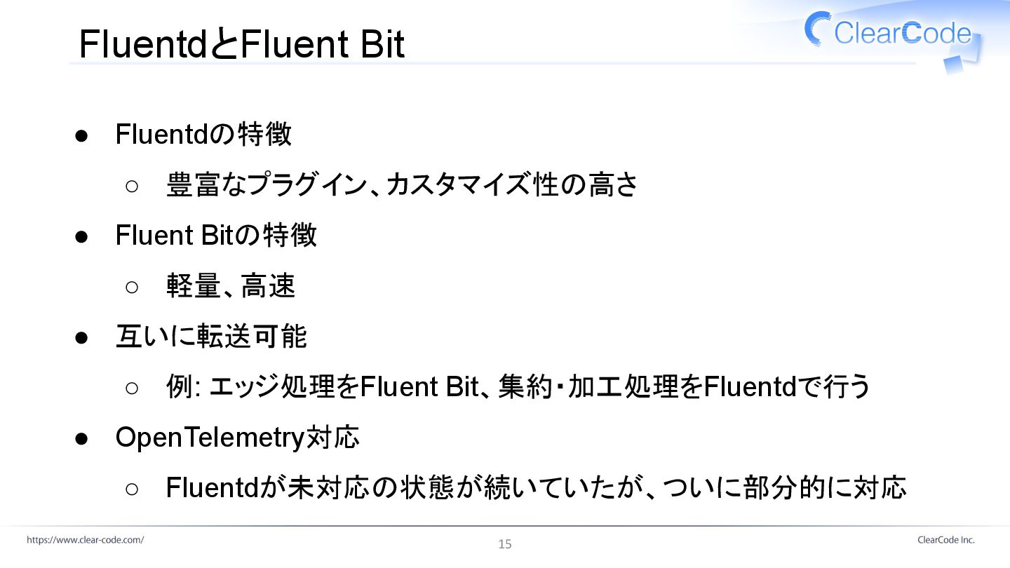 FluentdとFluent Bit • Fluentdの特徴 ◦ 豊富なプラグイン、カスタマイズ性の高さ • Fluent Bitの特徴 ◦