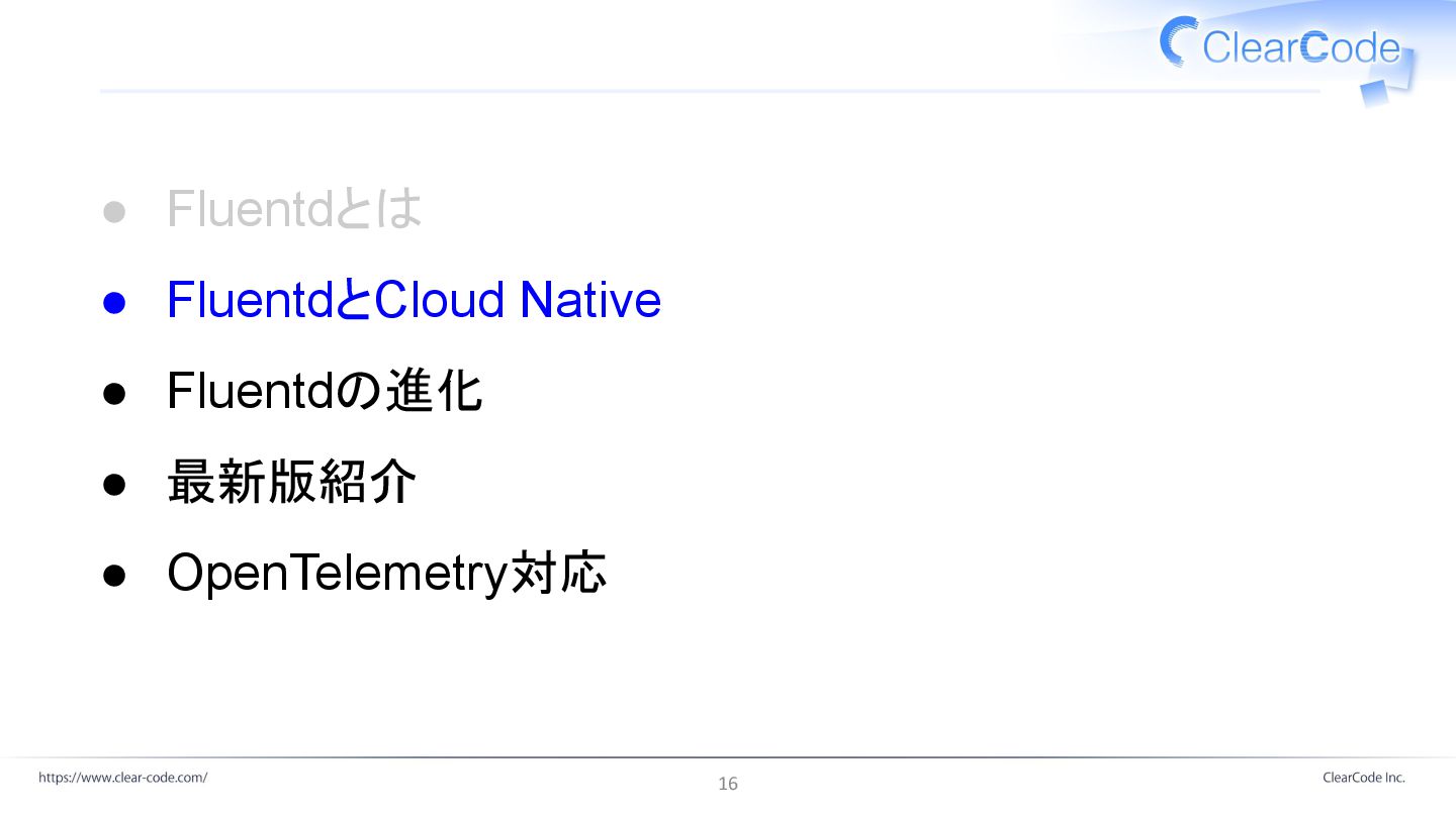 軽量、高速 • 互いに転送可能 ◦ 例: エッジ処理をFluent Bit、集約・加工処理をFluentdで行う • OpenTelemetry対応 ◦ Fluentdが未対応の状態が続いていたが、ついに部分的に対応 15