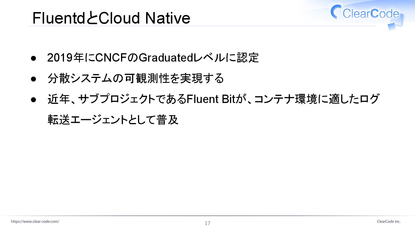 FluentdとCloud Native • 2019年にCNCFのGraduatedレベルに認定 • 分散システムの可観測性を実現する • 近年、サブプロジェクトであるFluent Bitが、コンテナ環境に適したログ 転送エージェントとして普及