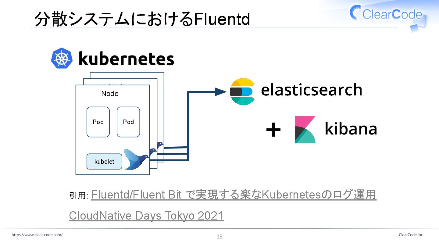 Node Pod Pod kubelet 分散システムにおけるFluentd 引用: Fluentd/Fluent Bit で実現する楽なKubernetesのログ運用 CloudNative