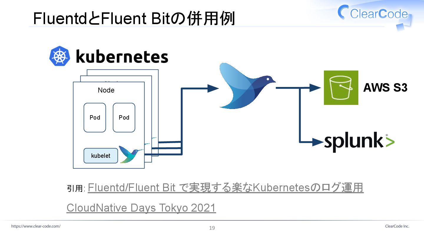 FluentdとFluent Bitの併用例 引用: Fluentd/Fluent Bit で実現する楽なKubernetesのログ運用 CloudNative Days Tokyo 2021