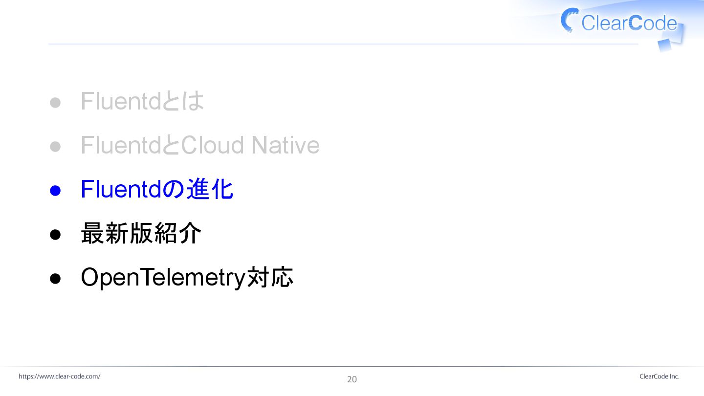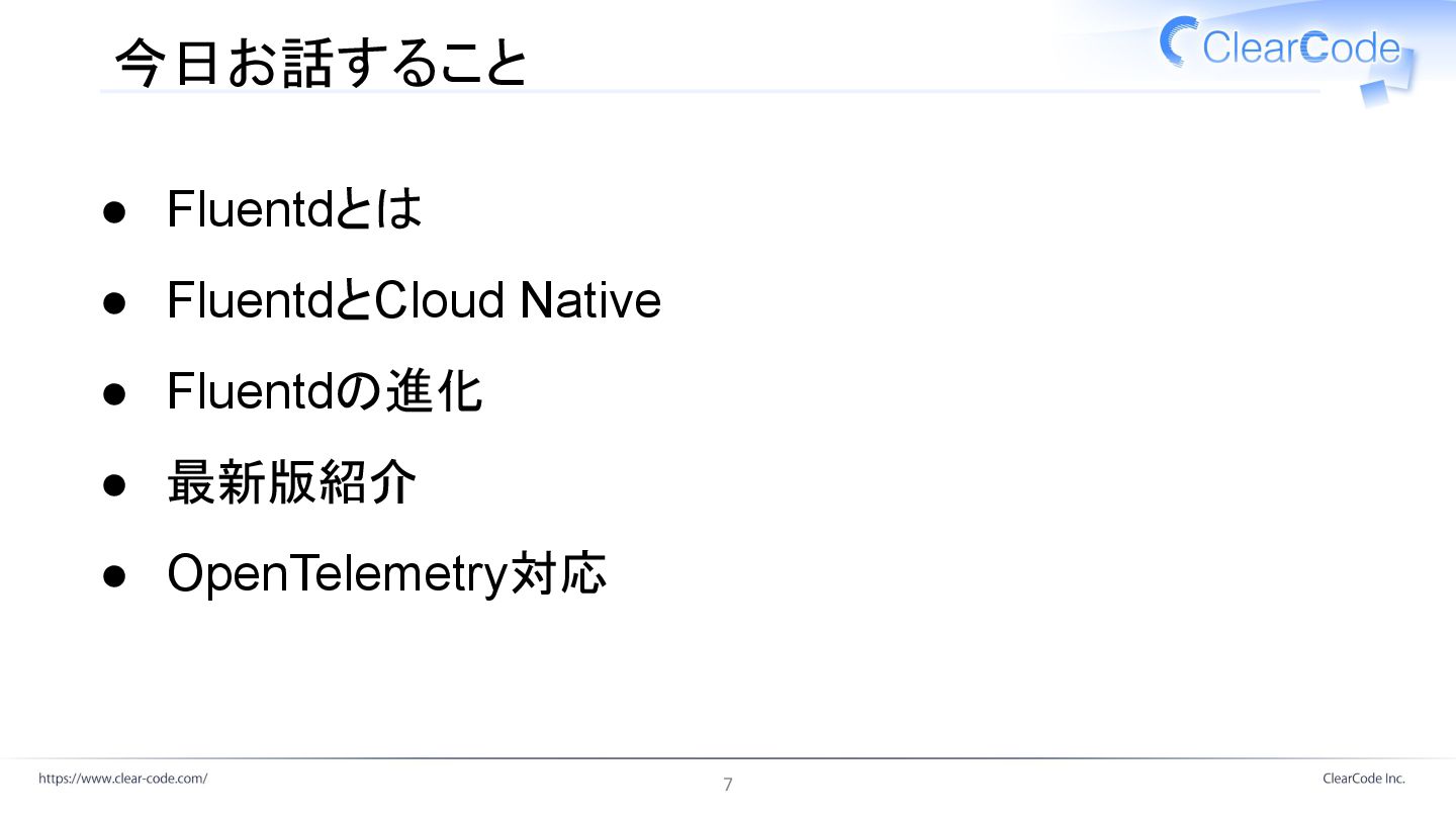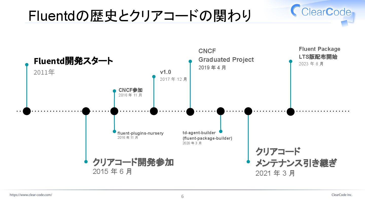 年 4 月 クリアコード メンテナンス引き継ぎ 2021 年 3 月 Fluentd開発スタート 2011年 CNCF参加 2016 年 11 月 Fluent Package LTS版配布開始 2023 年 8 月 v1.0 2017 年 12 月 td-agent-builder (fluent-package-builder) 2020 年 3 月 fluent-plugins-nursery 2016 年 11 月 6