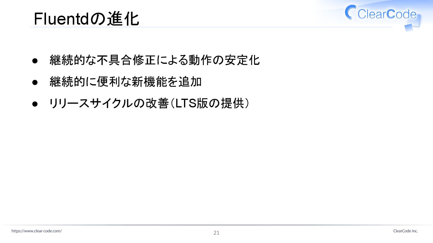 Fluentdの進化: リリースサイクル改善 • 長期サポート(LTS)版の提供を開始 ◦ サポート期間を事前アナウンス(約2年間) ◦ セキュリティー・バグフィックスのみを提供 • 現在のLTS版