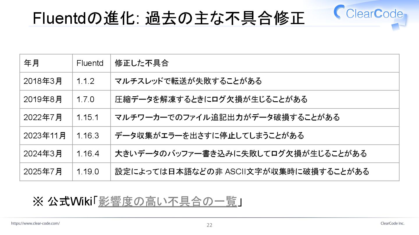 圧縮データを解凍するときにログ欠損が生じることがある 2022年7月 1.15.1 マルチワーカーでのファイル追記出力がデータ破損することがある 2023年11月 1.16.3 データ収集がエラーを出さすに停止してしまうことがある 2024年3月 1.16.4 大きいデータのバッファー書き込みに失敗してログ欠損が生じることがある 2025年7月 1.19.0 設定によっては日本語などの非 ASCII文字が収集時に破損することがある ※ 公式Wiki「影響度の高い不具合の一覧」 22