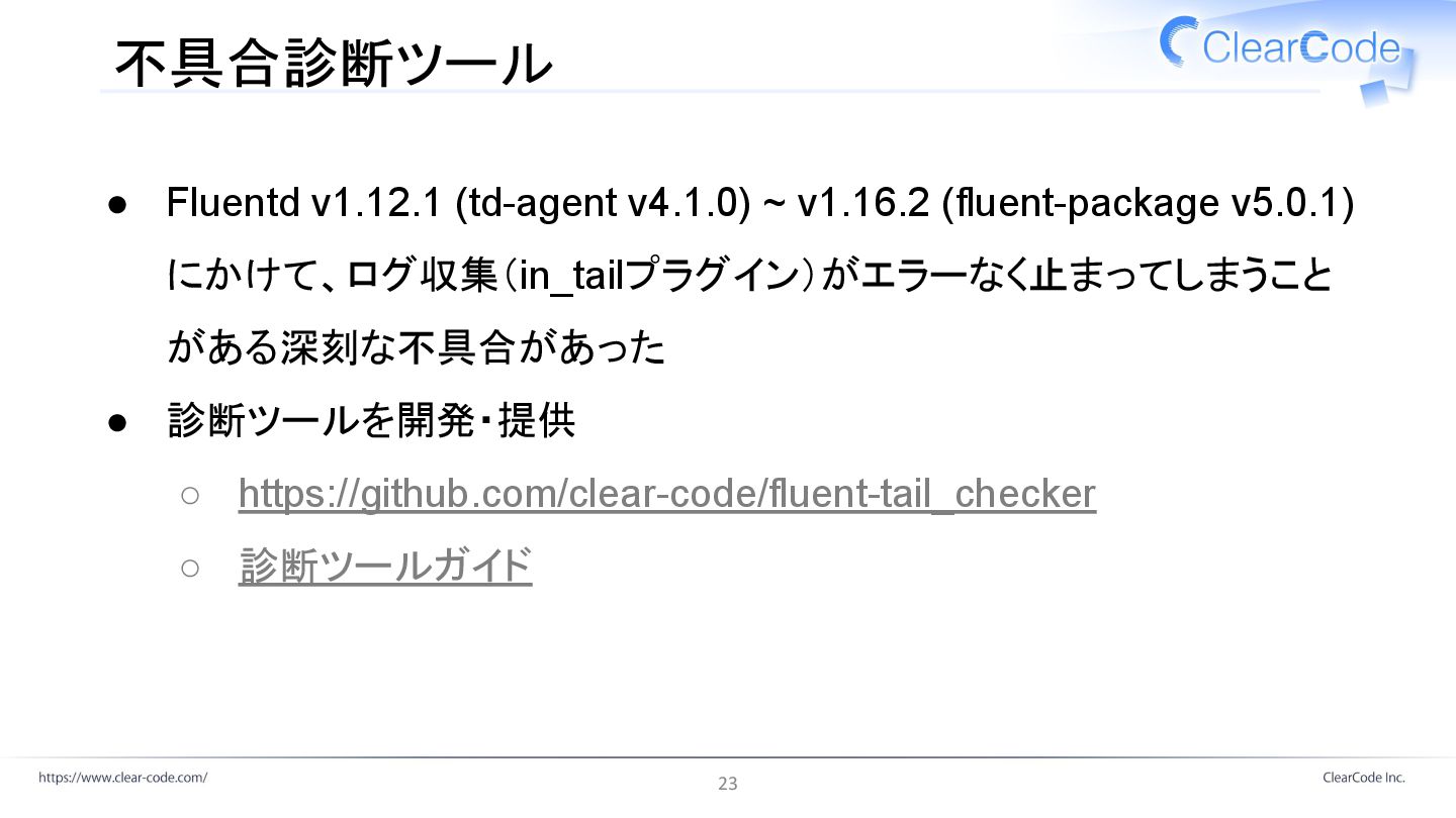 にかけて、ログ収集(in_tailプラグイン)がエラーなく止まってしまうこと がある深刻な不具合があった • 診断ツールを開発・提供 ◦ https://github.com/clear-code/fluent-tail_checker ◦ 診断ツールガイド 23