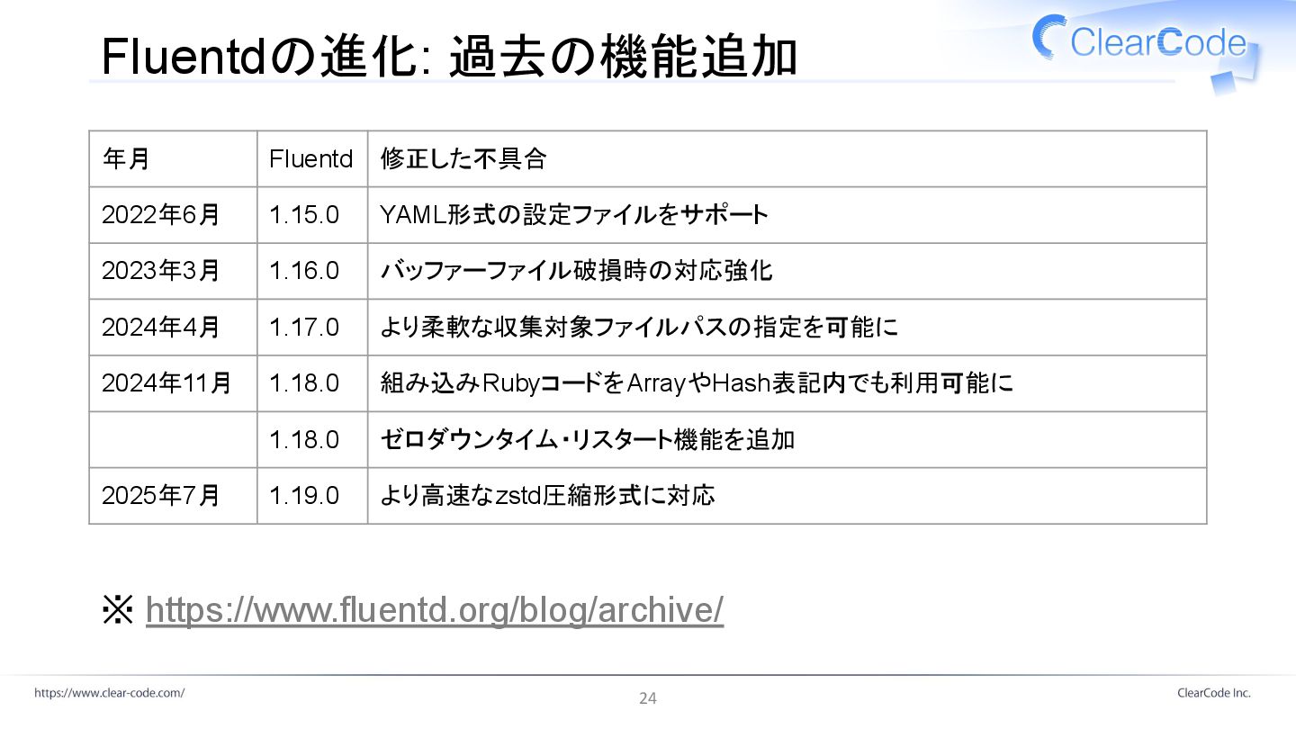 バッファーファイル破損時の対応強化 2024年4月 1.17.0 より柔軟な収集対象ファイルパスの指定を可能に 2024年11月 1.18.0 組み込みRubyコードをArrayやHash表記内でも利用可能に 1.18.0 ゼロダウンタイム・リスタート機能を追加 2025年7月 1.19.0 より高速なzstd圧縮形式に対応 ※ https://www.fluentd.org/blog/archive/ 24