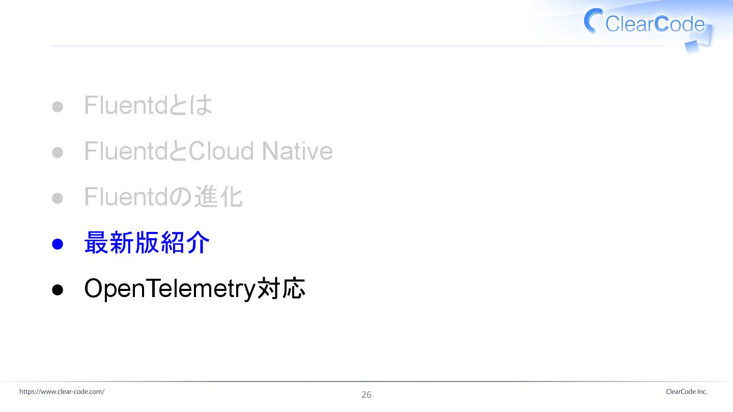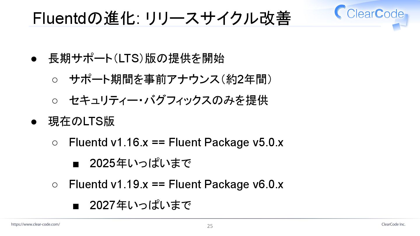 ◦ Fluentd v1.16.x == Fluent Package v5.0.x ▪ 2025年いっぱいまで ◦ Fluentd v1.19.x == Fluent Package v6.0.x ▪ 2027年いっぱいまで 25