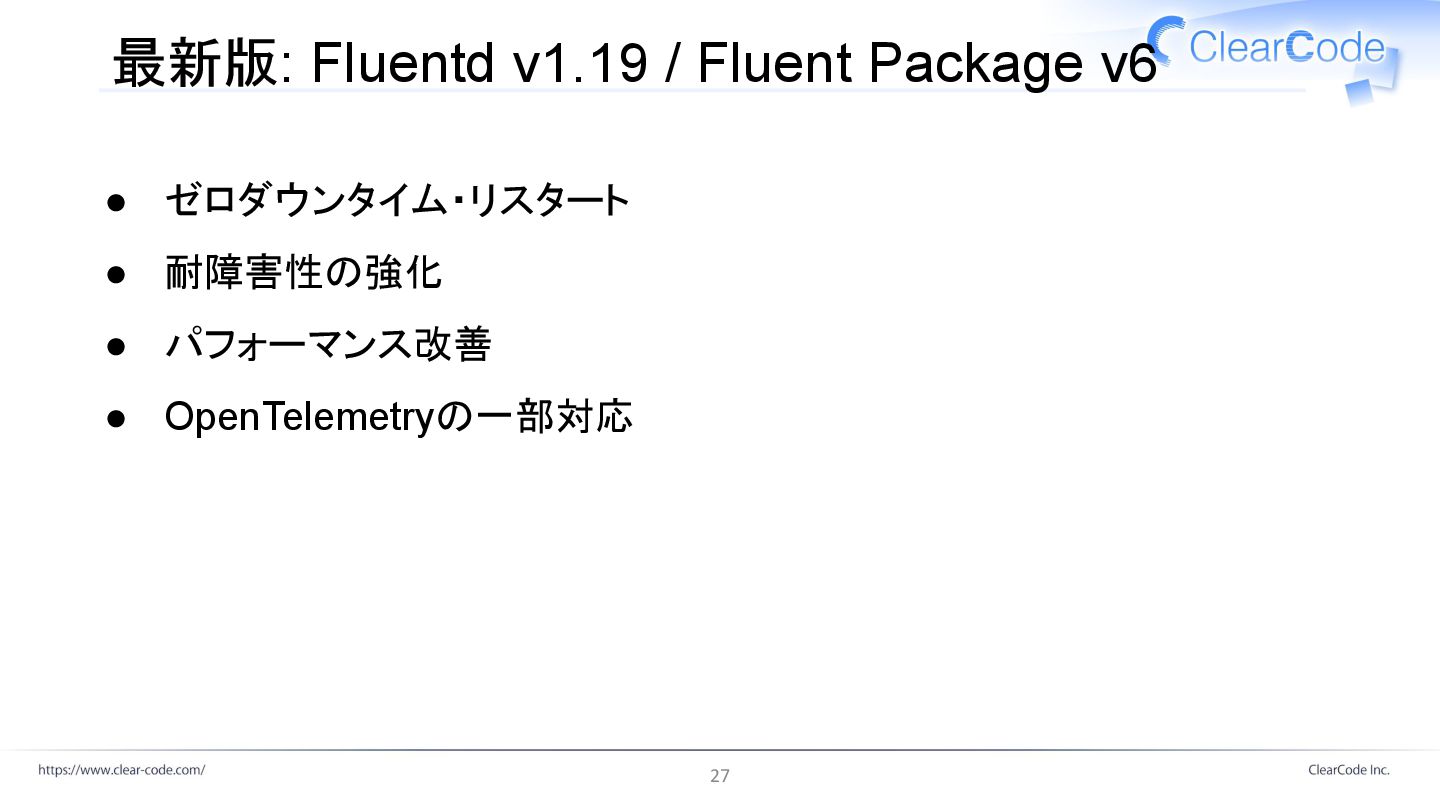 最新版: Fluentd v1.19 / Fluent Package v6 • ゼロダウンタイム・リスタート •