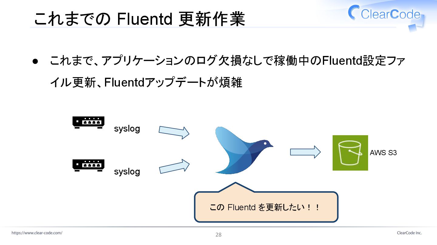 これまでの Fluentd 更新作業 • これまで、アプリケーションのログ欠損なしで稼働中のFluentd設定ファ イル更新、Fluentdアップデートが煩雑 AWS S3 この Fluentd