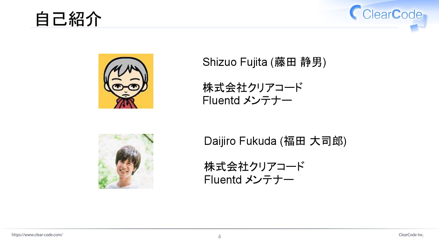 Shizuo Fujita (藤田 静男) 株式会社クリアコード Fluentd メンテナー Daijiro Fukuda (福田