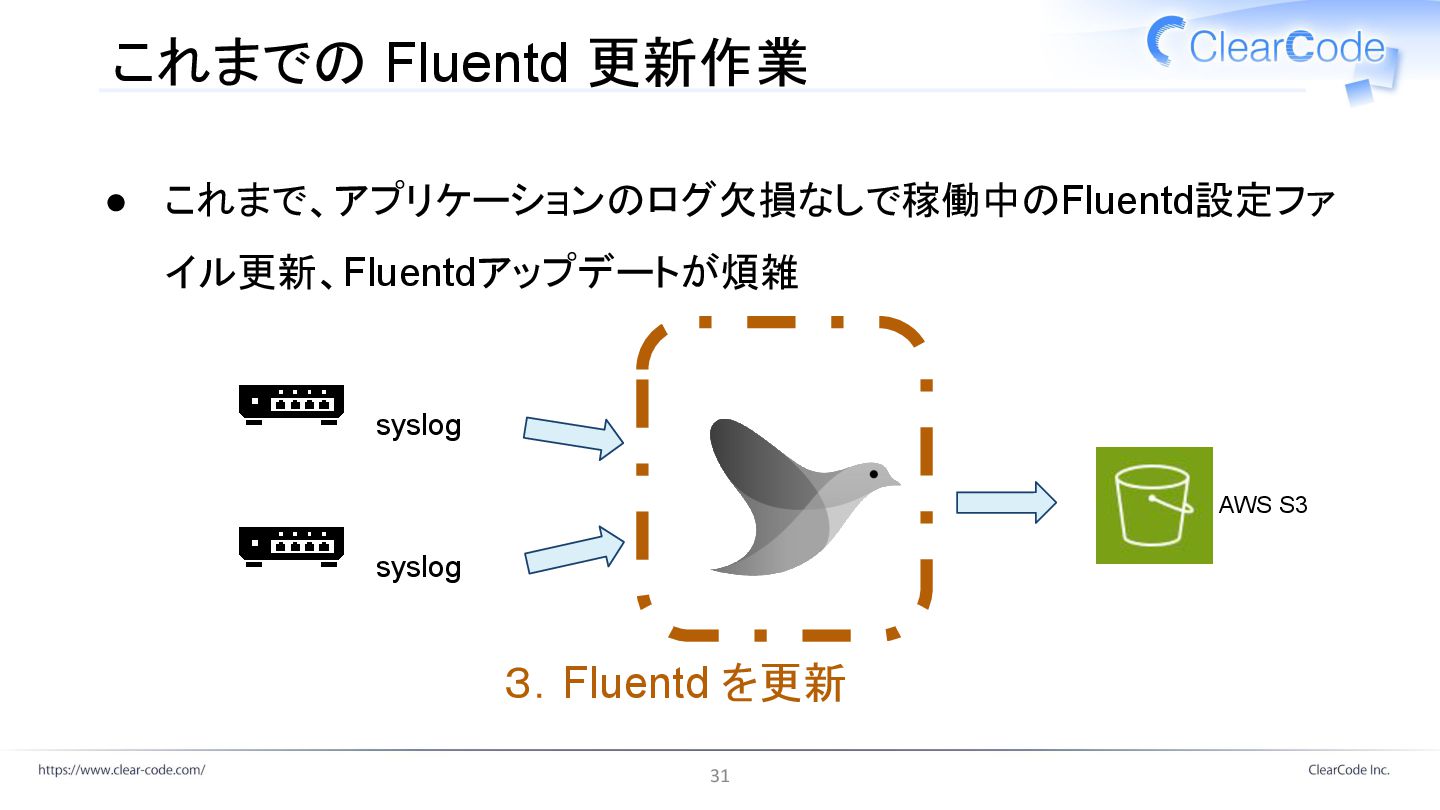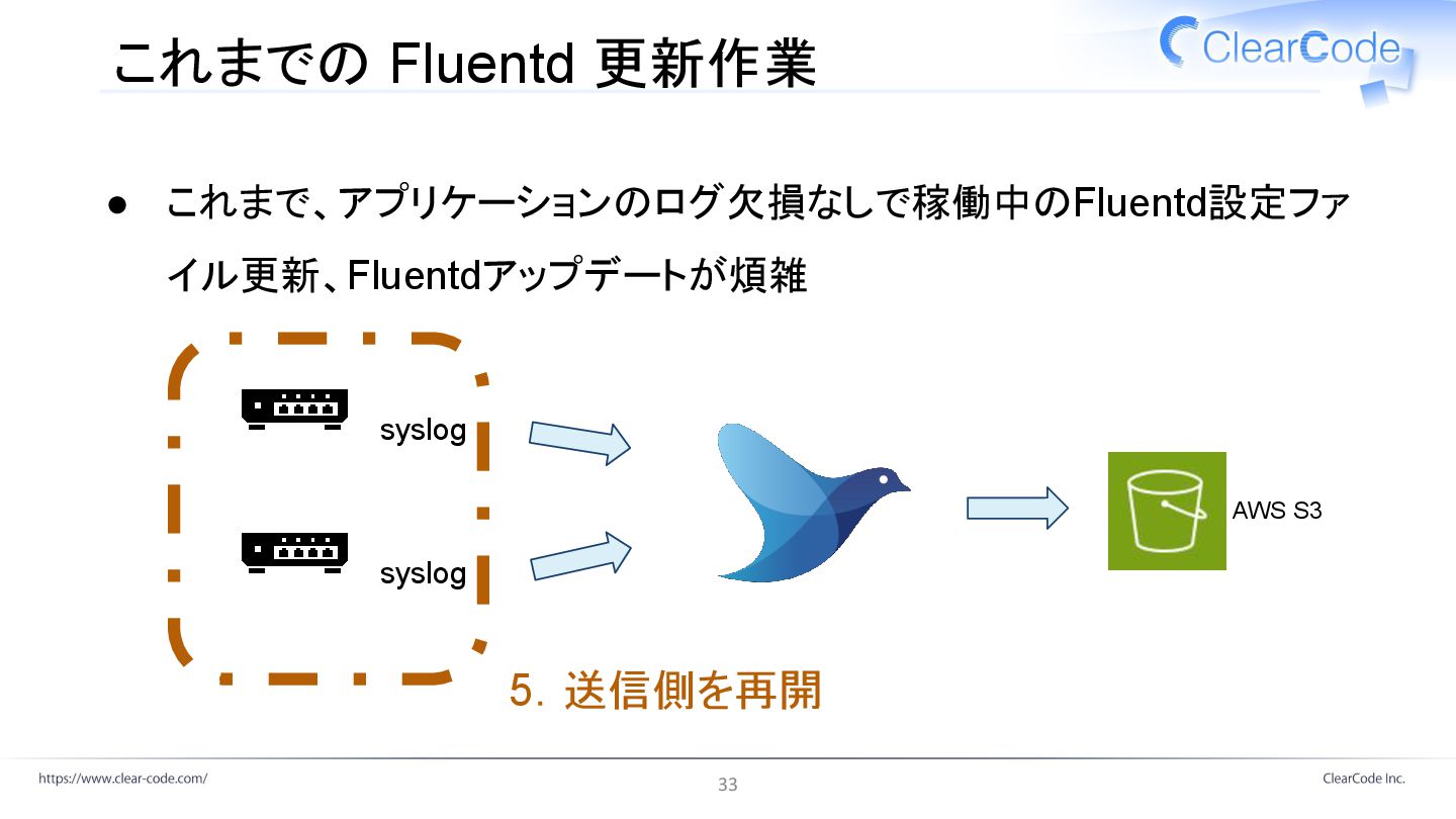 これまでの Fluentd 更新作業 • これまで、アプリケーションのログ欠損なしで稼働中のFluentd設定ファ イル更新、Fluentdアップデートが煩雑 AWS S3 5.送信側を再開 syslog