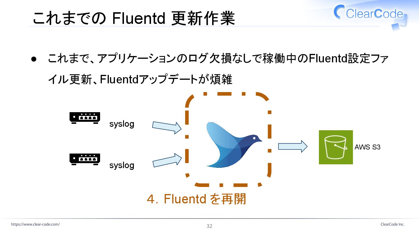 これまでの Fluentd 更新作業 • これまで、アプリケーションのログ欠損なしで稼働中のFluentd設定ファ イル更新、Fluentdアップデートが煩雑 AWS S3 4.Fluentd を再開