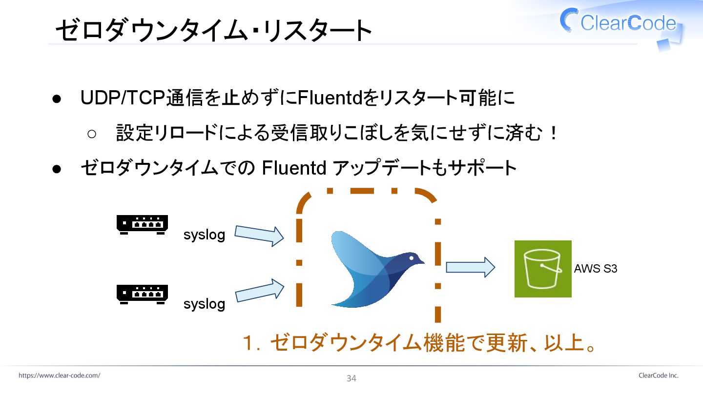 ゼロダウンタイム・リスタート • UDP/TCP通信を止めずにFluentdをリスタート可能に ◦ 設定リロードによる受信取りこぼしを気にせずに済む! • ゼロダウンタイムでの Fluentd アップデートもサポート AWS