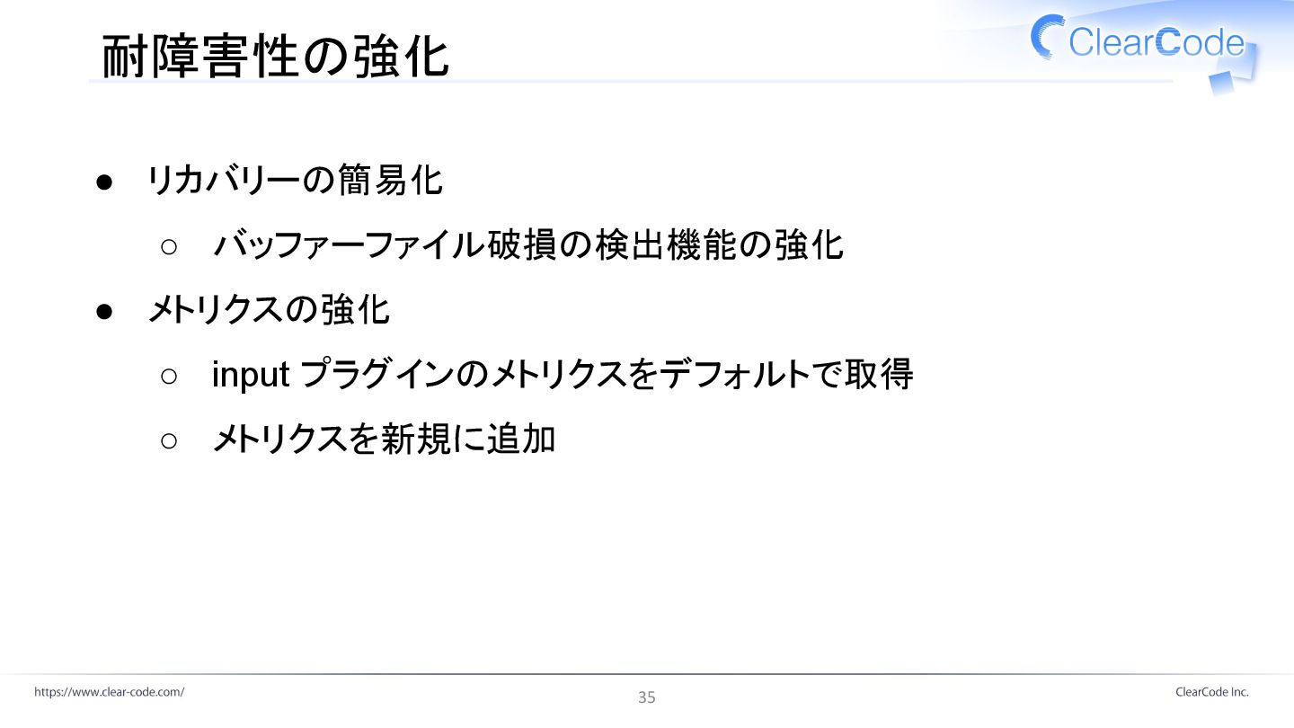 耐障害性の強化 • リカバリーの簡易化 ◦ バッファーファイル破損の検出機能の強化 • メトリクスの強化 ◦ input プラグインのメトリクスをデフォルトで取得