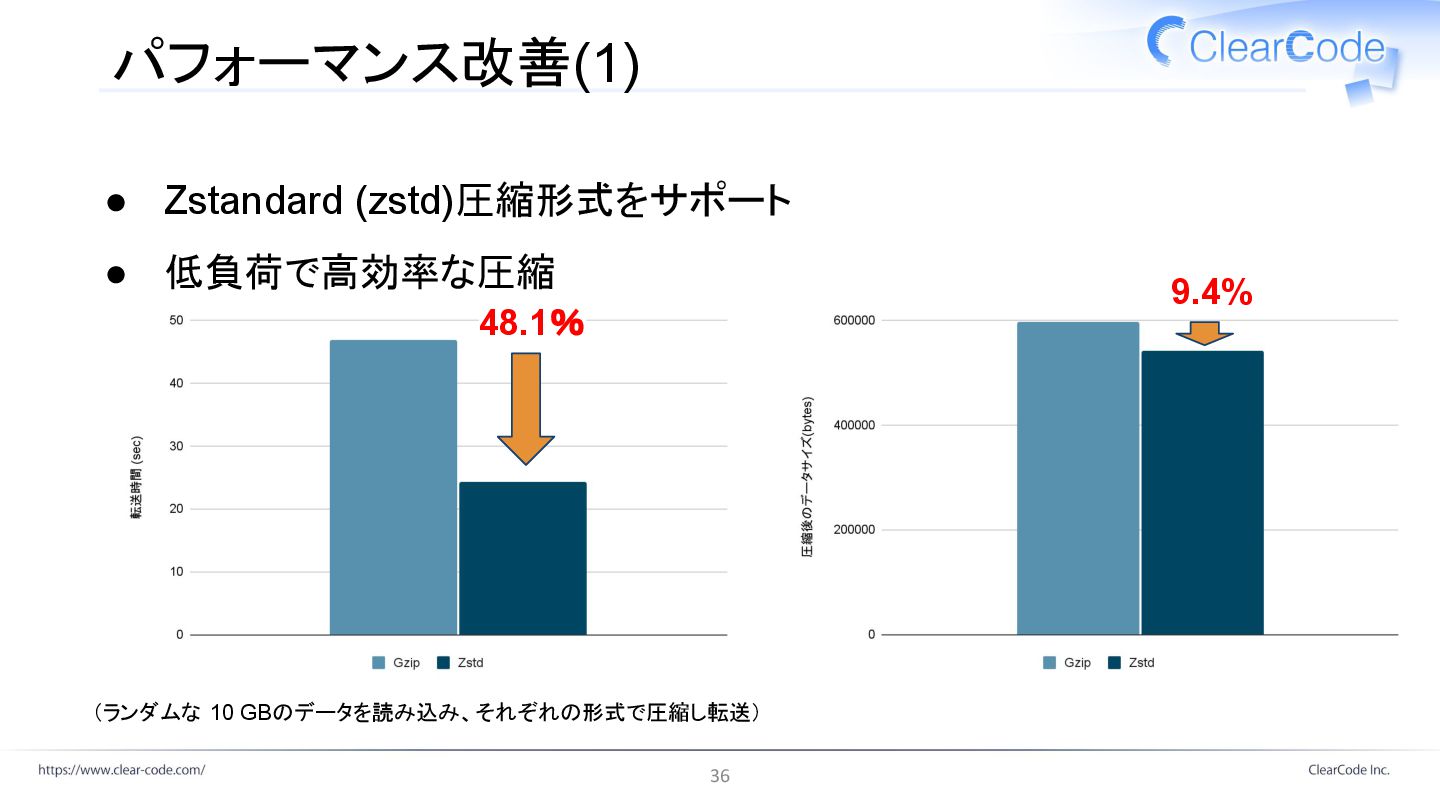パフォーマンス改善(1) • Zstandard (zstd)圧縮形式をサポート • 低負荷で高効率な圧縮 9.4% (ランダムな 10 GBのデータを読み込み、それぞれの形式で圧縮し転送)