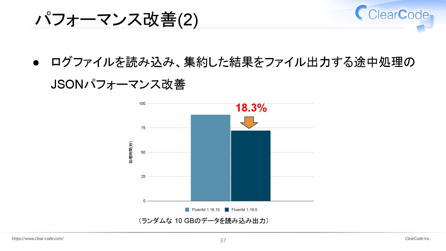 パフォーマンス改善(2) • ログファイルを読み込み、集約した結果をファイル出力する途中処理の JSONパフォーマンス改善 18.3% 18.3% (ランダムな 10 GBのデータを読み込み出力) 37