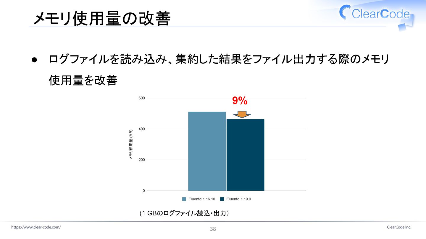 メモリ使用量の改善 • ログファイルを読み込み、集約した結果をファイル出力する際のメモリ 使用量を改善 9% (1 GBのログファイル読込・出力) 38