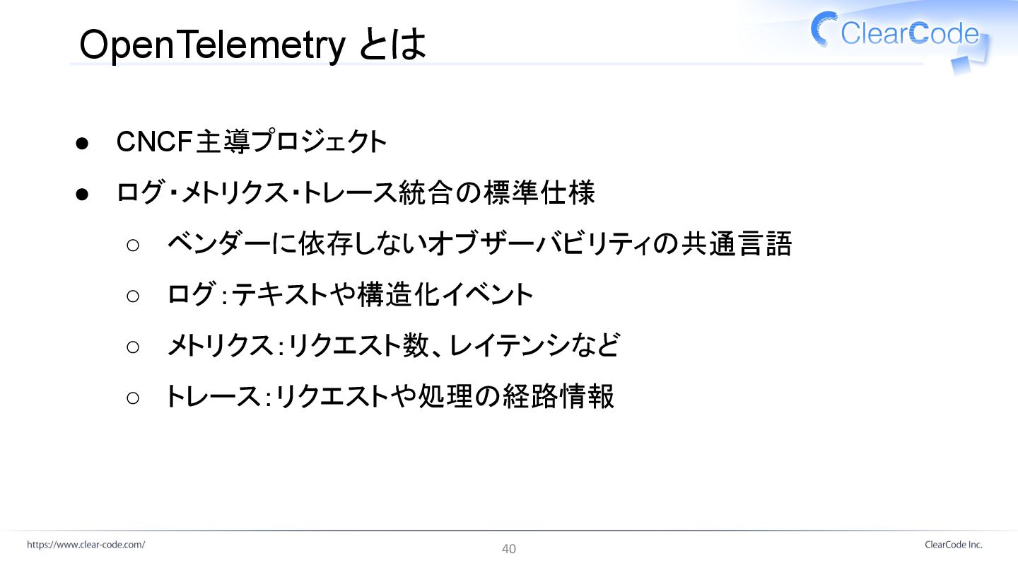 OpenTelemetry とは • CNCF主導プロジェクト • ログ・メトリクス・トレース統合の標準仕様 ◦ ベンダーに依存しないオブザーバビリティの共通言語 ◦ ログ:テキストや構造化イベント