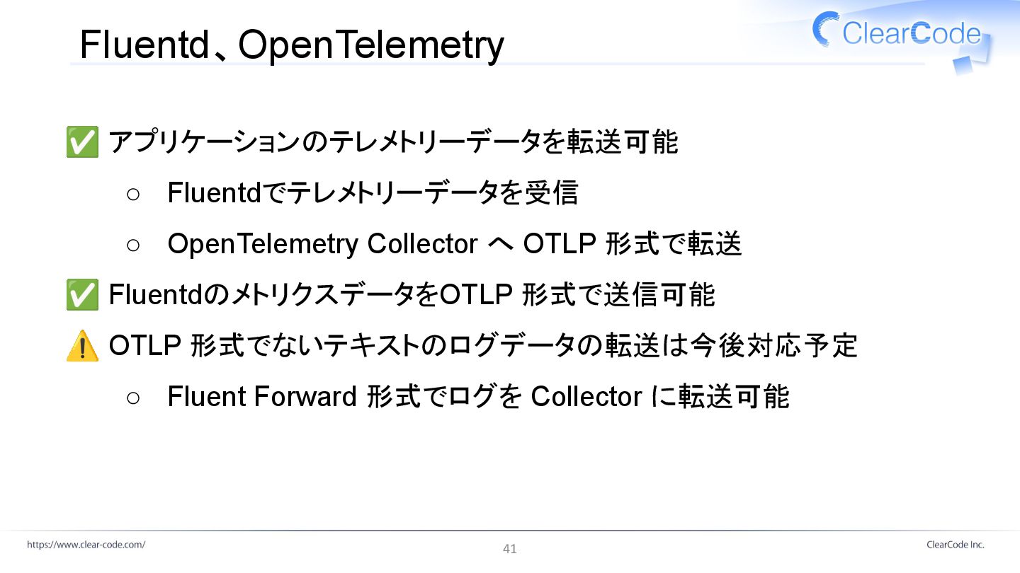 形式で転送 ✅ FluentdのメトリクスデータをOTLP 形式で送信可能 ⚠ OTLP 形式でないテキストのログデータの転送は今後対応予定 ◦ Fluent Forward 形式でログを Collector に転送可能 41