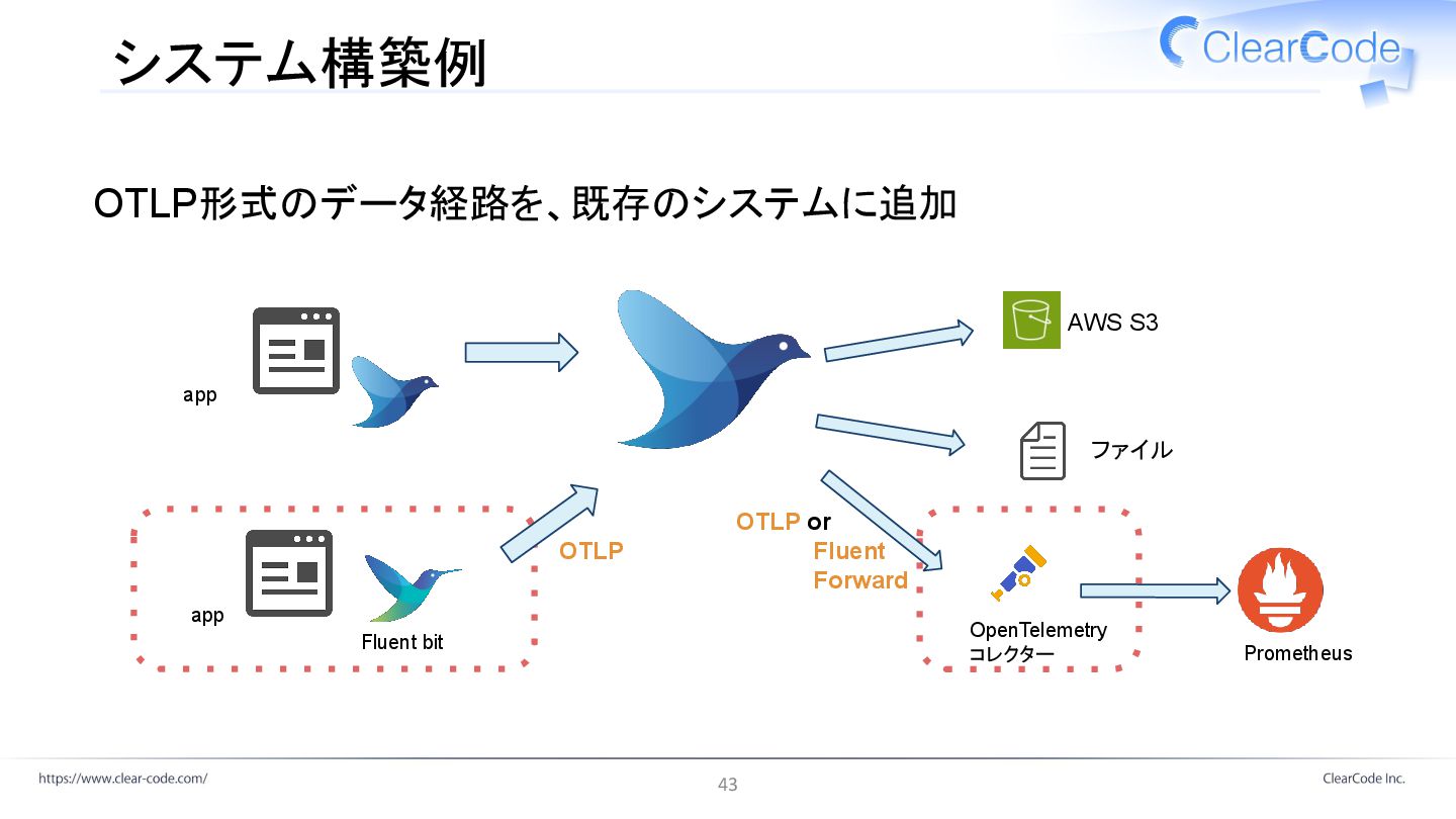 システム構築例 app ファイル AWS S3 OTLP形式のデータ経路を、既存のシステムに追加 app OTLP OTLP or