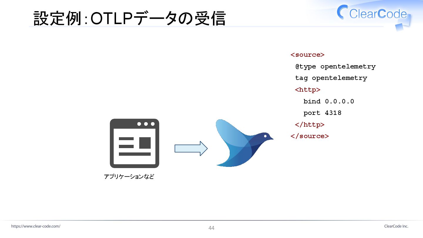 設定例:OTLPデータの受信 <source> @type opentelemetry tag opentelemetry <http> bind 0.0.0.0 port