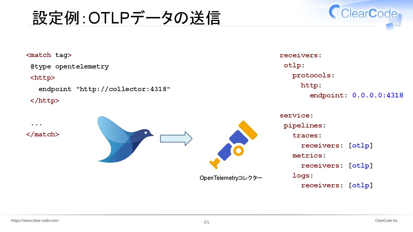 </match> OpenTelemetryコレクター receivers: otlp: protocols: http: endpoint: 0.0.0.0:4318 service: pipelines: traces: receivers: [otlp] metrics: receivers: [otlp] logs: receivers: [otlp] 45