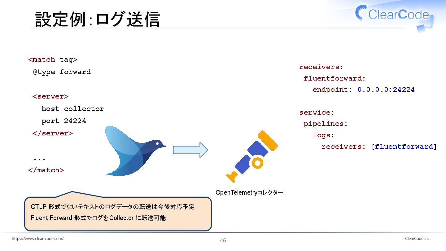 </server> ... </match> OpenTelemetryコレクター receivers: fluentforward: endpoint: 0.0.0.0:24224 service: pipelines: logs: receivers: [fluentforward] OTLP 形式でないテキストのログデータの転送は今後対応予定 Fluent Forward 形式でログを Collector に転送可能 46