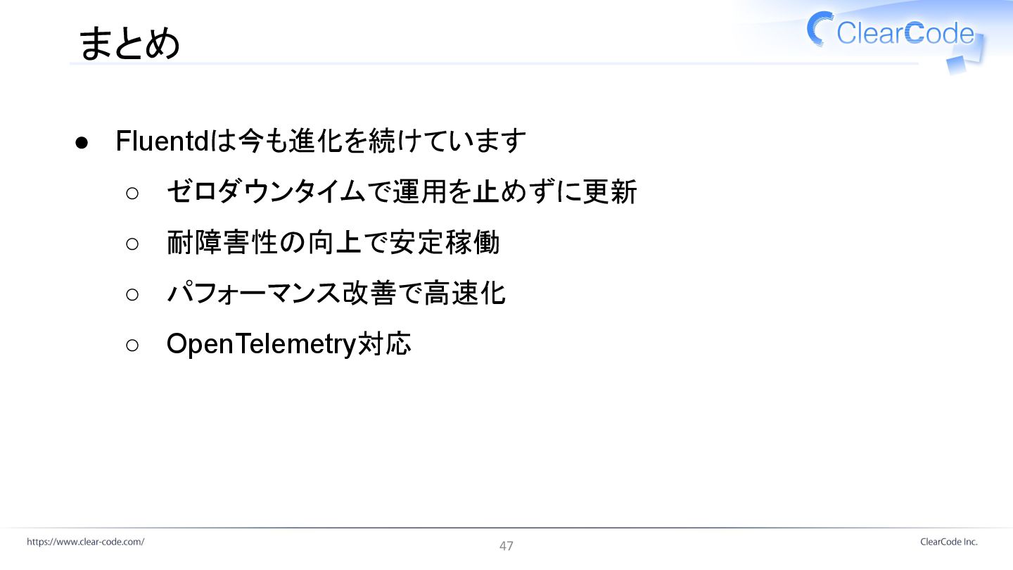 まとめ • Fluentdは今も進化を続けています ◦ ゼロダウンタイムで運用を止めずに更新 ◦ 耐障害性の向上で安定稼働 ◦ パフォーマンス改善で高速化 ◦