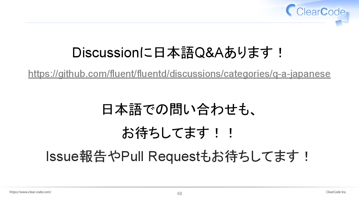 Discussionに日本語Q&Aあります! https://github.com/fluent/fluentd/discussions/categories/q-a-japanese 日本語での問い合わせも、 お待ちしてます!! Issue報告やPull Requestもお待ちしてます! 48