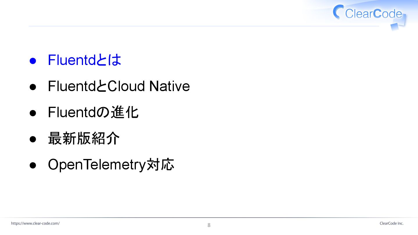 • Fluentdとは • FluentdとCloud Native • Fluentdの進化 • 最新版紹介 •