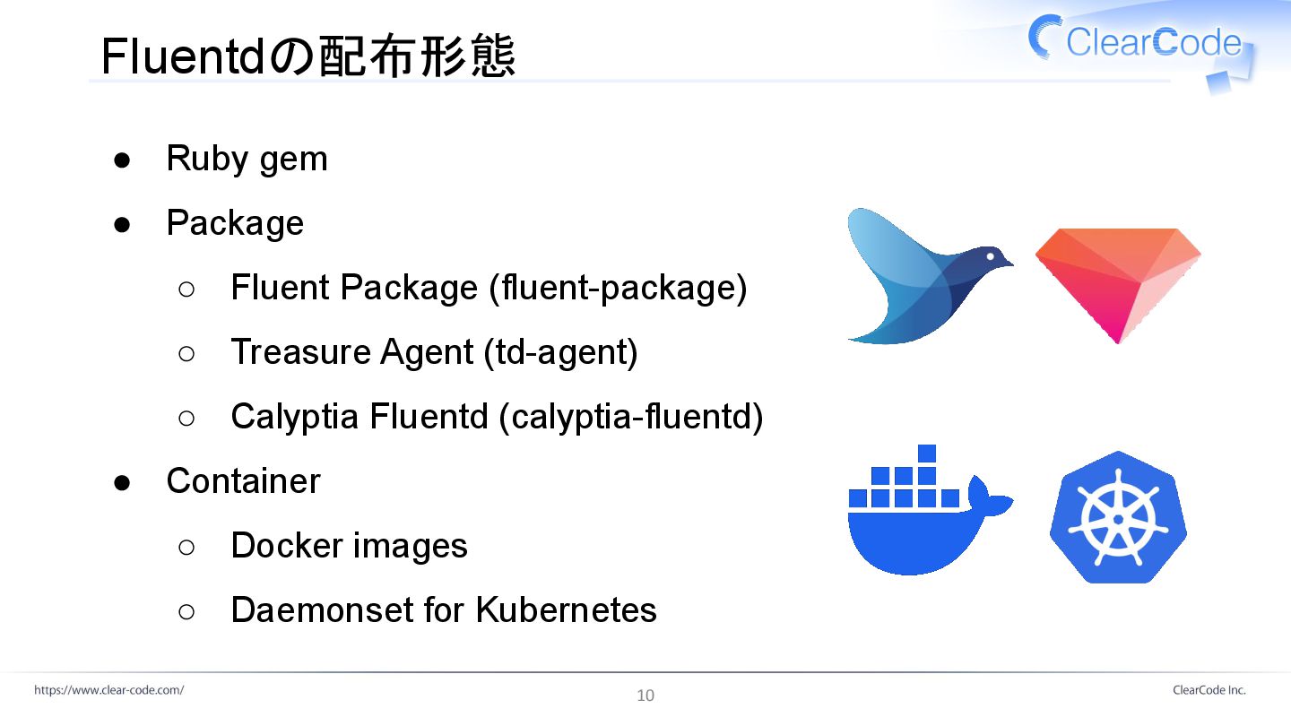Fluentdの配布形態 • Ruby gem • Package ◦ Fluent Package (fluent-package)