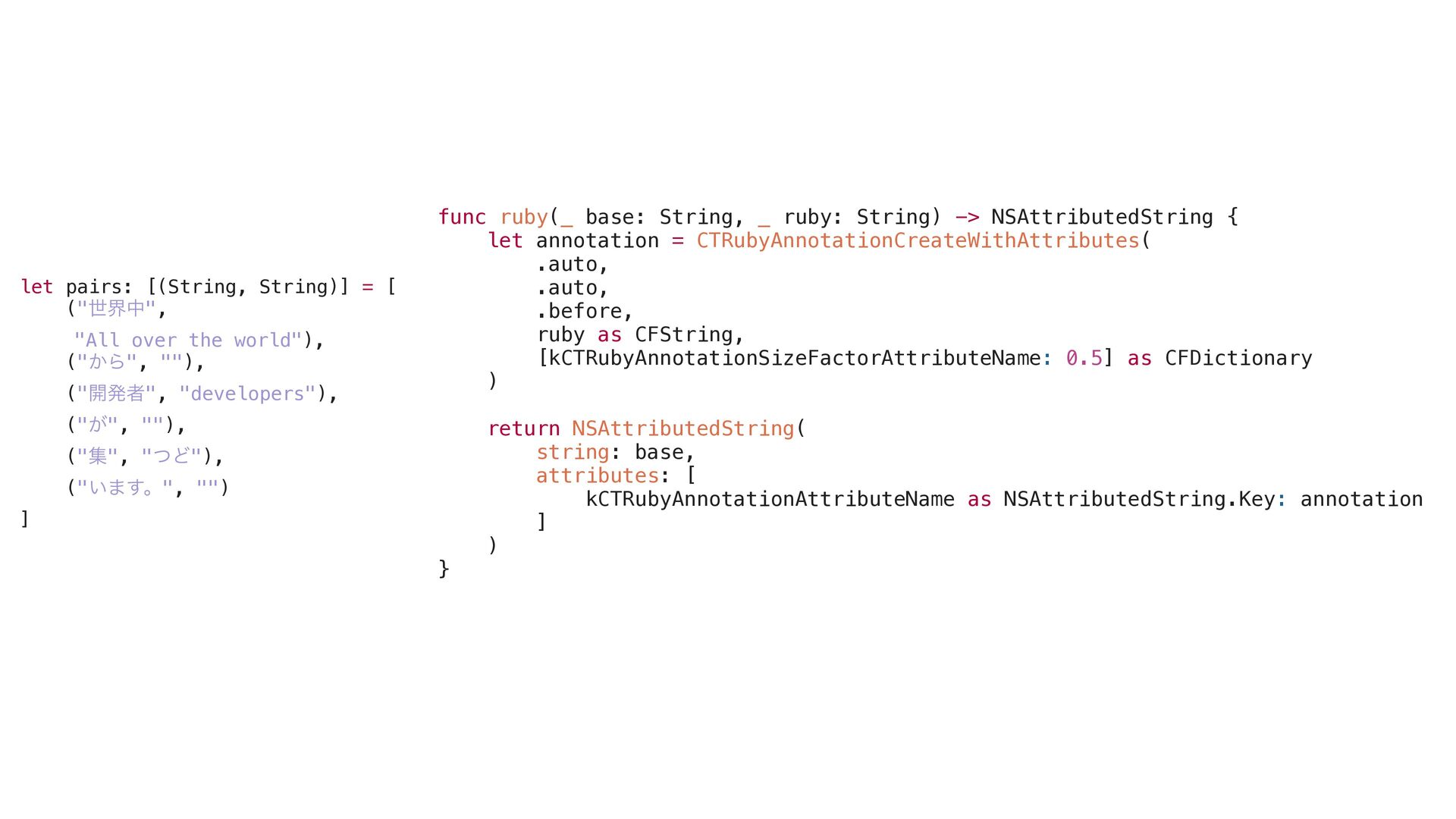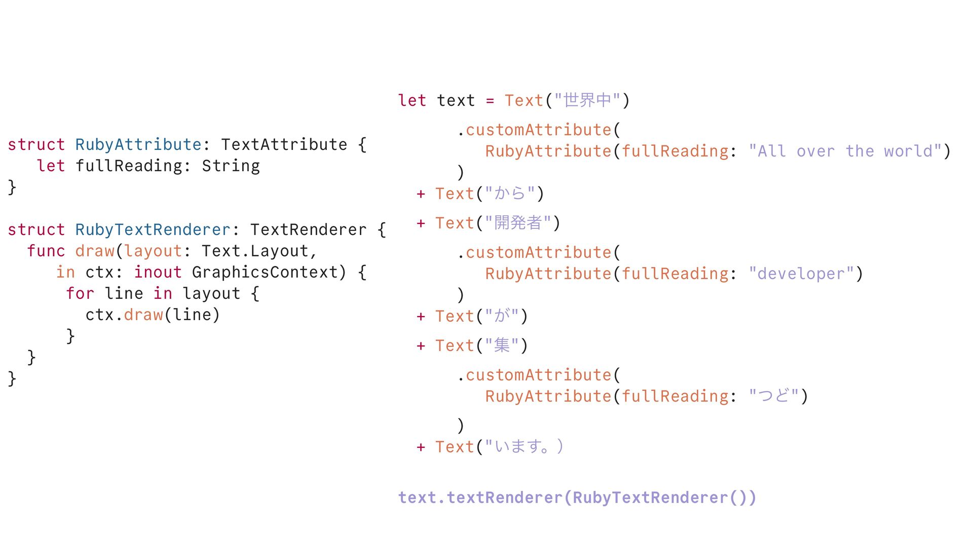 T e x tA t tr ib u te { l e t f u llR e a d i ng : S t r ing } s tr uct Ru byTe xtRe nd e re r : T e xt Re nd e re r { f u n c dr aw ( la yo ut : T e x t . La yo ut , i n ctx: in o ut G ra p h i cs C o n t e xt ) { f o r l i ne i n la yo u t { ctx.dr aw (l ine ) } } } l e t text = T e xt ("ੈքத") . c u s t o m At tr i bu te( Ru by At tr i bu te( f u llRe a d i ng : "A l l o v e r t he wo rl d") ) + T e xt ("͔Β") + T e xt ("։ൃऀ") . c u s t o m At tr i bu te( Ru by At tr i bu te( f u llRe a d i ng : " d ev e l o p er ") ) + T e xt ("͕") + T e xt ("ू") . c u s t o m At tr i bu te( Ru by At tr i bu te( f u llRe a d i ng : "ͭͲ") ) + T e xt ("͍·͢ɻʣ tex t . text Re nd e re r ( Ru byTe xtRe nd e re r ())