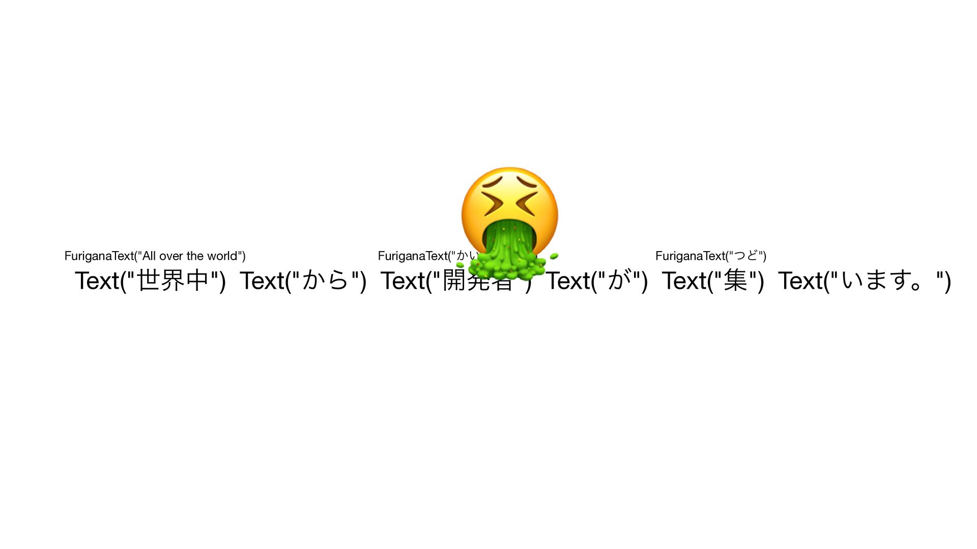 world"), ("͔Β", ""), ("։ൃऀ", "developers"), ("͕", ""), ("ू", "ͭͲ"), ("͍·͢ɻ", "") ] func ruby(_ base: String, _ ruby: String) -> NSAttributedString { let annotation = CTRubyAnnotationCreateWithAttributes( .auto, .auto, .before, ruby as CFString, [kCTRubyAnnotationSizeFactorAttributeName: 0.5] as CFDictionary ) return NSAttributedString( string: base, attributes: [ kCTRubyAnnotationAttributeName as NSAttributedString.Key: annotation ] ) }