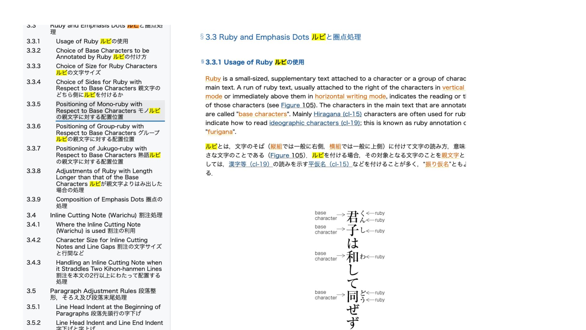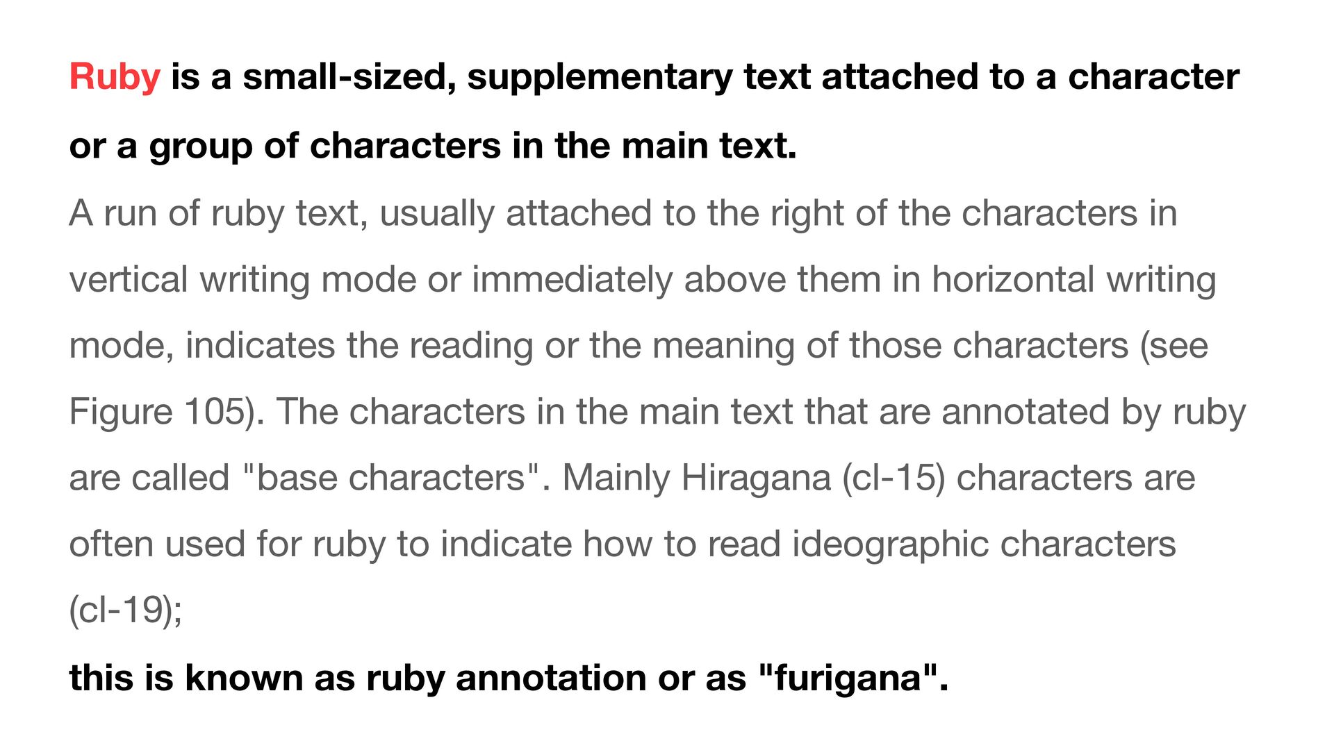 or a group of characters in the main text. A run of ruby text, usually attached to the right of the characters in vertical writing mode or immediately above them in horizontal writing mode, indicates the reading or the meaning of those characters (see Figure 105). The characters in the main text that are annotated by ruby are called "base characters". Mainly Hiragana (cl-15) characters are often used for ruby to indicate how to read ideographic characters (cl-19); this is known as ruby annotation or as "furigana".