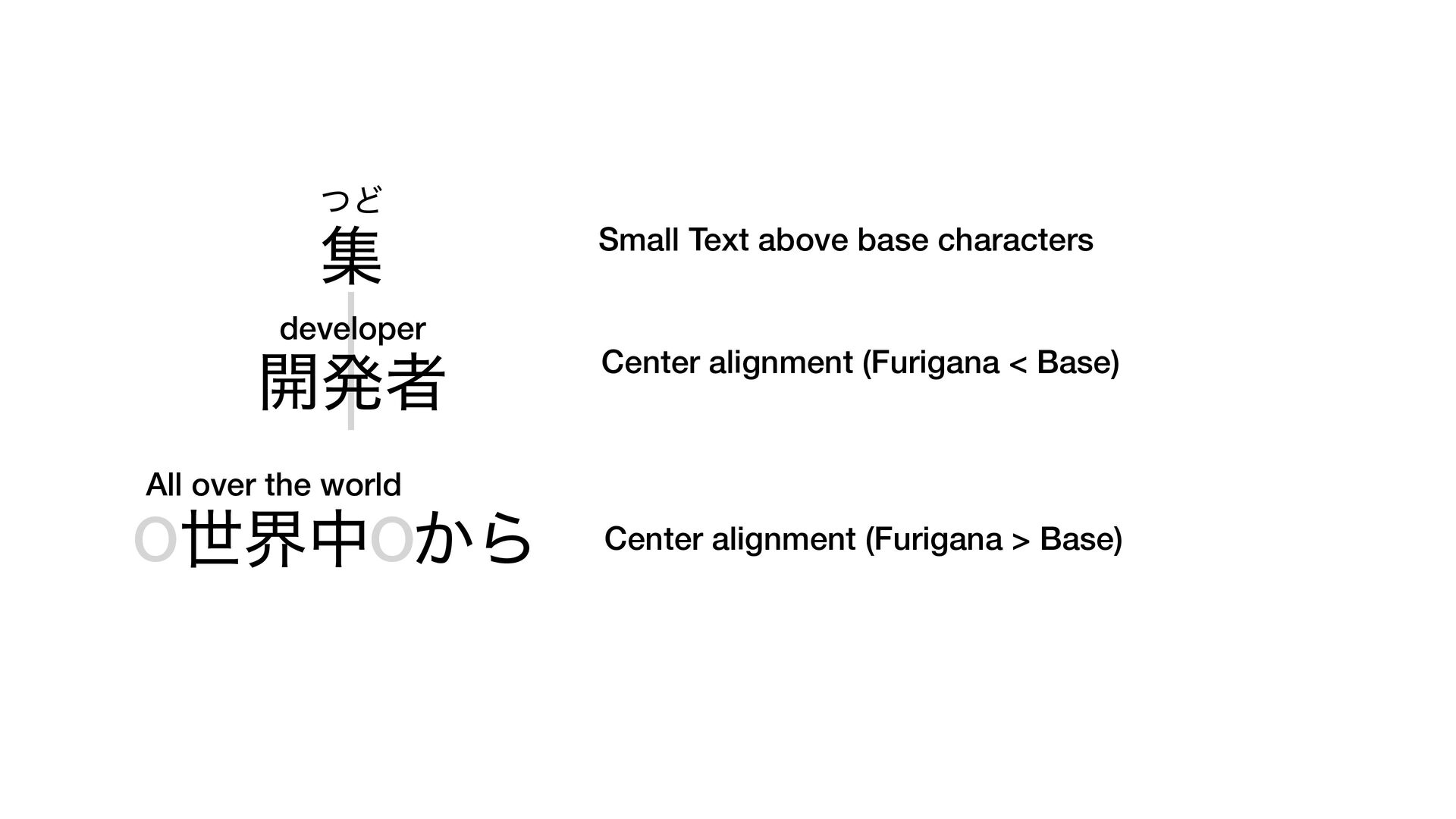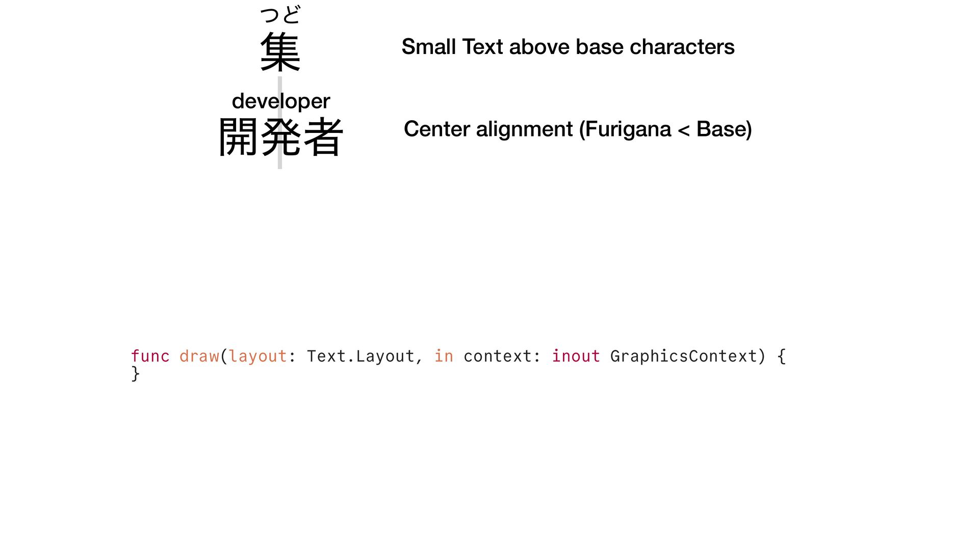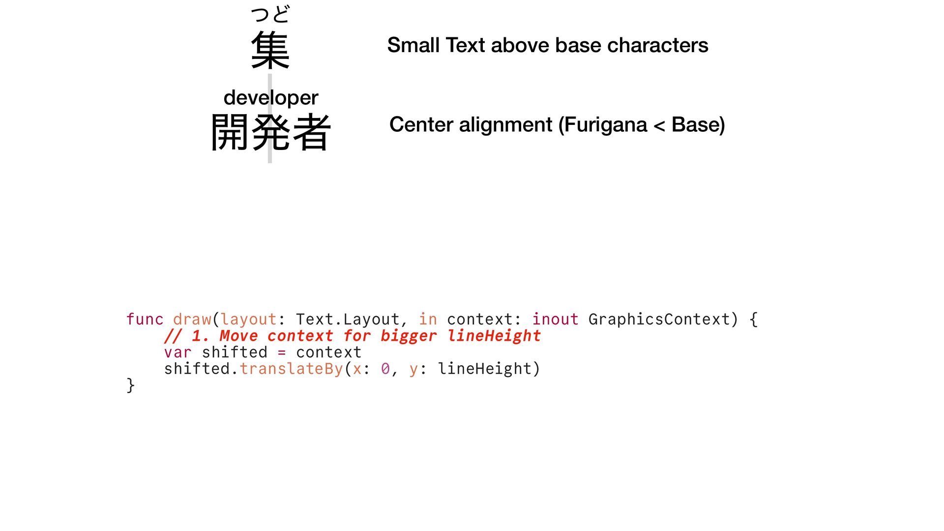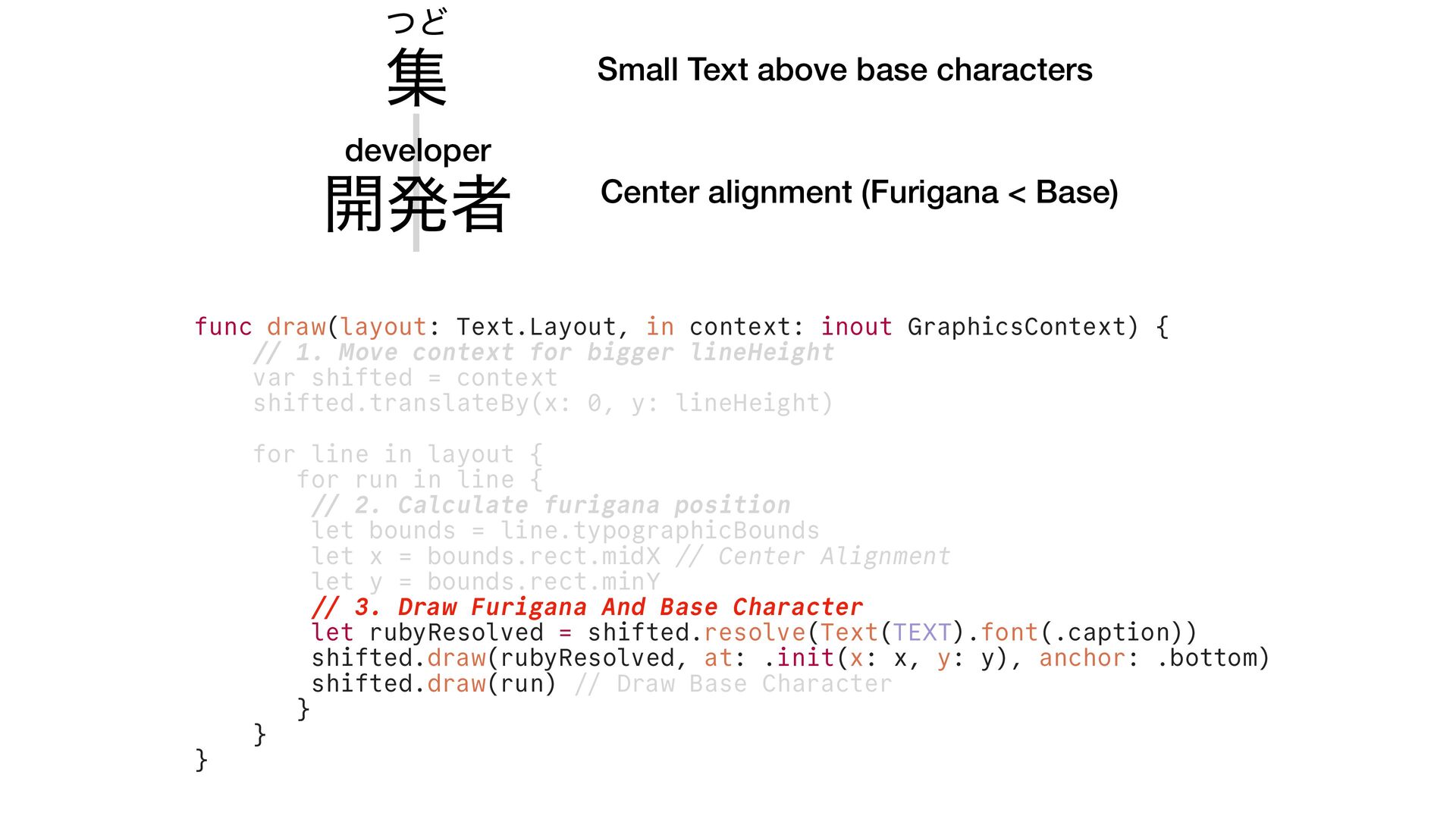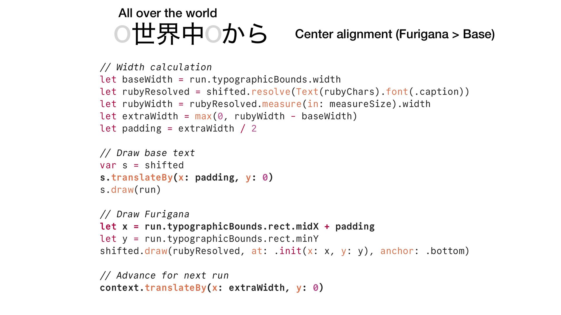 alignment (Furigana < Base) fu n c dr aw ( la yo ut : T e xt . La yo ut , i n c o n t e xt : i n o u t G ra p h i cs C on t ex t ) { // 1. Mo v e c o n t ext f o r bi g g e r l in e H e i g ht var s hi f ted = c o n t e xt shi f t ed .t ra n s lat e B y (x: 0, y: l ine H e i gh t ) f o r l ine i n la yo ut { f o r r un i n l ine { / / 2. Ca l c u late f u rig an a p o si t i on l e t b ound s = l i ne . ty po g r a p h i c B o und s l e t x = b ound s . rect .m idX / / C en te r A lig n m ent l e t y = b ound s . rect .m inY / / 3. D raw Furi g an a A n d Ba s e Ch a r a c te r l e t ru b y R e s o l v e d = sh i f t ed . re s o l ve ( T e xt ( T EXT ) . font (. c a p tion )) s hi f ted .dr aw ( ru b y R e s o l v e d , a t : . i n i t(x: x, y: y), a nch o r : . b ottom ) s hi f ted .dr aw ( ru n ) // D ra w Ba s e Cha r a c te r } } }