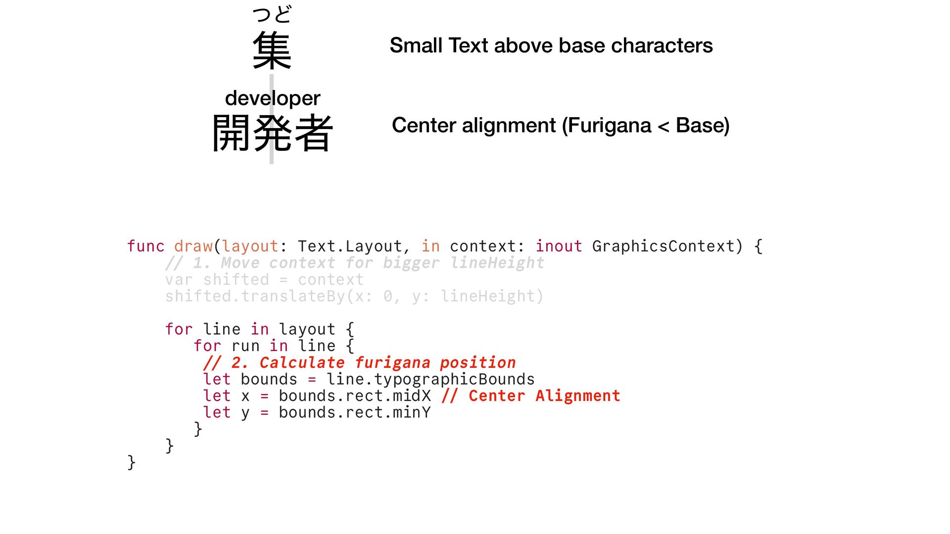 alignment (Furigana < Base) fu n c dr aw ( la yo ut : T e xt . La yo ut , i n c o n t e xt : i n o u t G ra p h i cs C on t ex t ) { // 1. Mo v e c o n t ext f o r bi g g e r l in e H e i g ht var s hi f ted = c o n t e xt shi f t ed .t ra n s lat e B y (x: 0, y: l ine H e i gh t ) f o r l ine i n la yo ut { f o r r un i n l ine { / / 2. Ca l c u late f u rig an a p o si t i on l e t b ound s = l i ne . ty po g r a p h i c B o und s l e t x = b ound s . rect .m idX / / C en te r A lig n m ent l e t y = b ound s . rect .m inY } } }