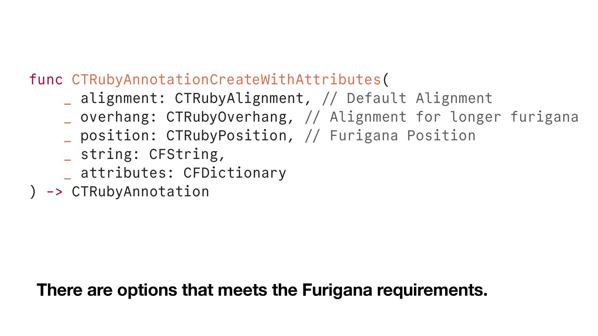 tionCr ea t eW ithAt tr ibu t es ( _ a l ign m en t : C TR u by Align m ent , // De f au l t A l ig n m e nt _ o v e r h an g : C TR u b y O ve r h an g , / / A lig n m e nt f o r lo ng e r f u r ig an a _ p o si t i on : C TR u byPo si t i on , / / Furi g an a P o s i t ion _ s t r ing : C F S t r ing , _ a t tr ib u t es : C F Di c tio n a ry ) -> C TR u byAnn o ta tion There are options that meets the Furigana requirements.