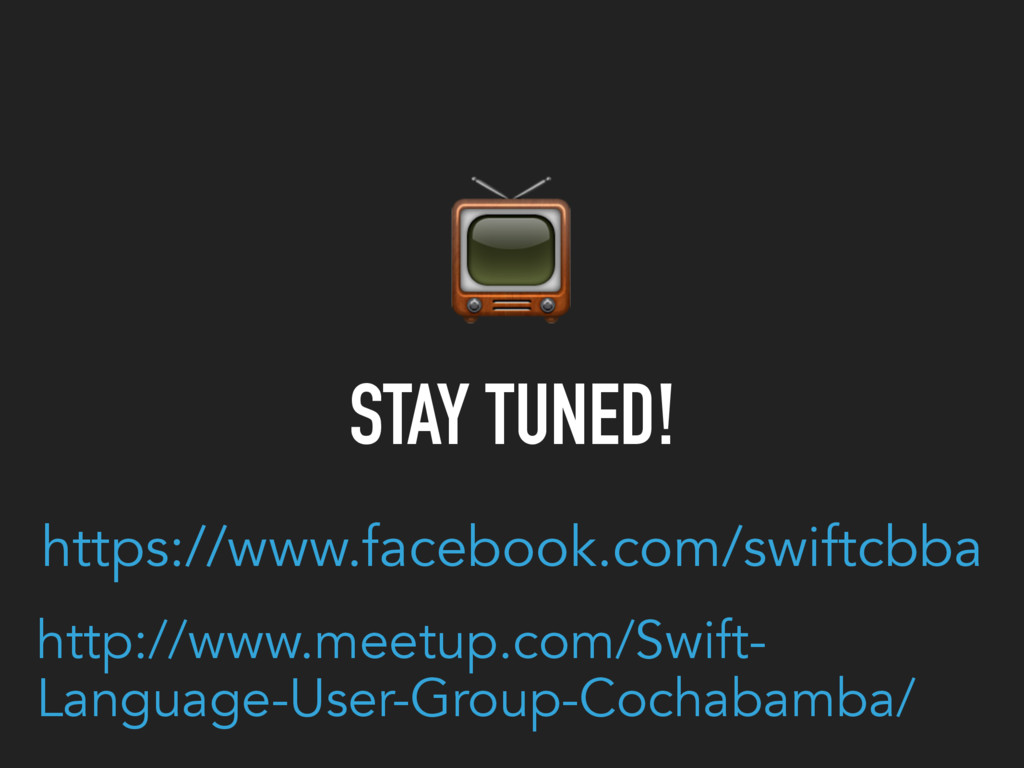 STAY TUNED! https://www.facebook.com/swiftcbba http://www.meetup.com/Swift- Language-User-Group-Cochabamba/