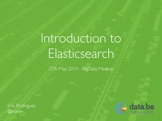Use cases, getting started, Rest CRUD API, Mapping, Search API, Query DSL with queries and filters, Analyzers, Analytics with facets and aggregations, Percolator, High Availability, Clients & Integrations, ...
