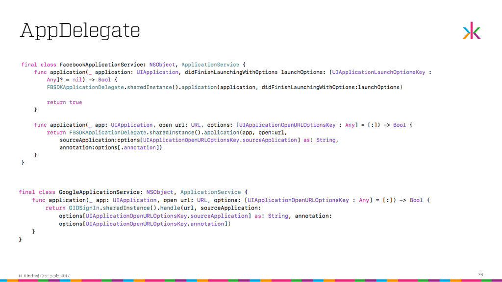 • Difficult to remember what every line of code does • Different libraries may require you to have code in didFinishLaunchingWithOptions and didReceiveRemoteNotification The solution is to use PluggableApplicationDelegate which allows you to treat each library as a service.