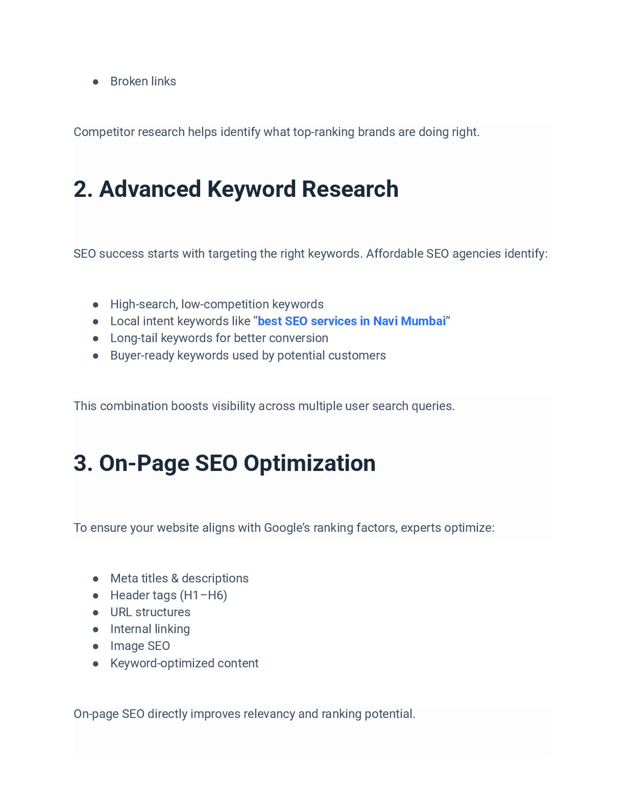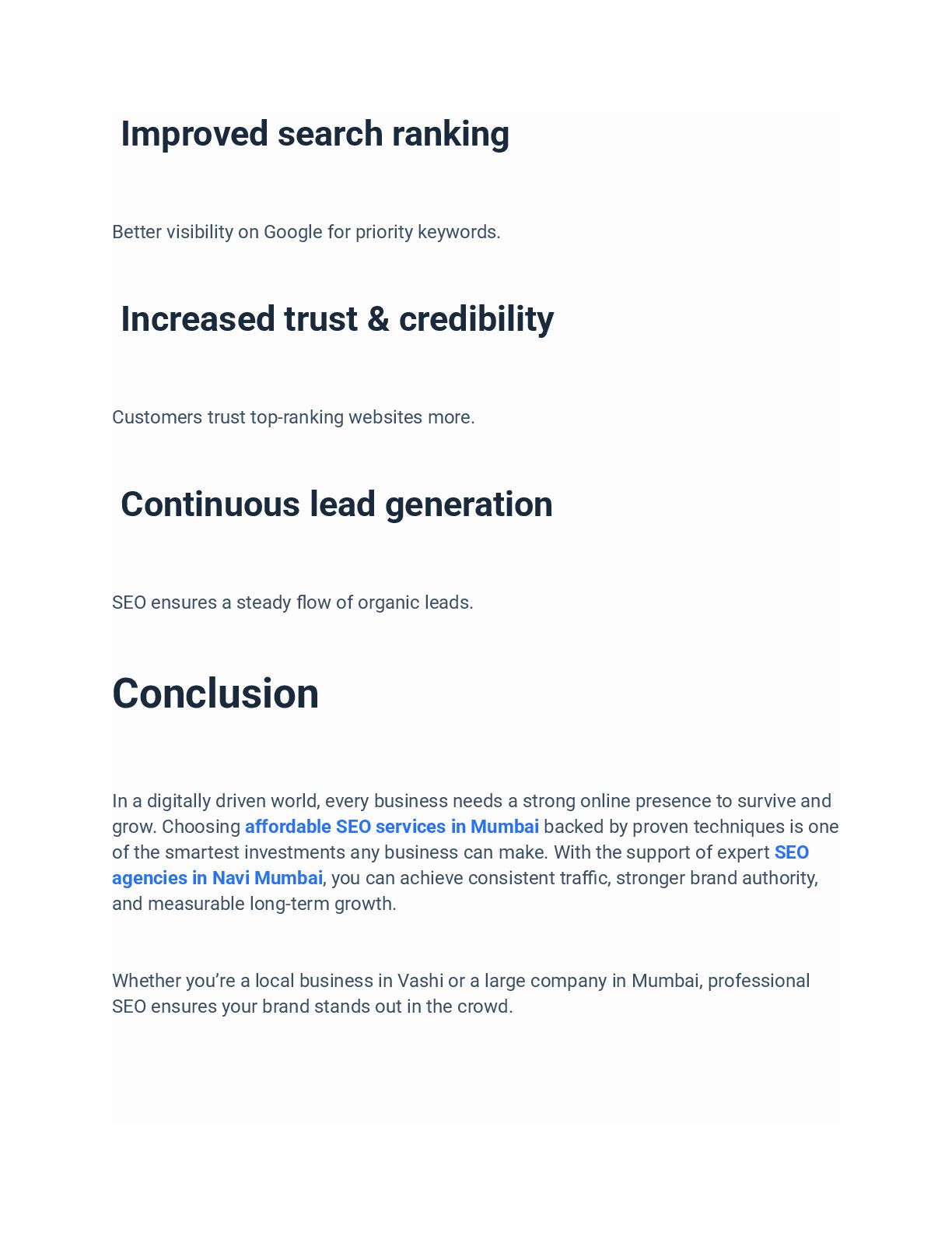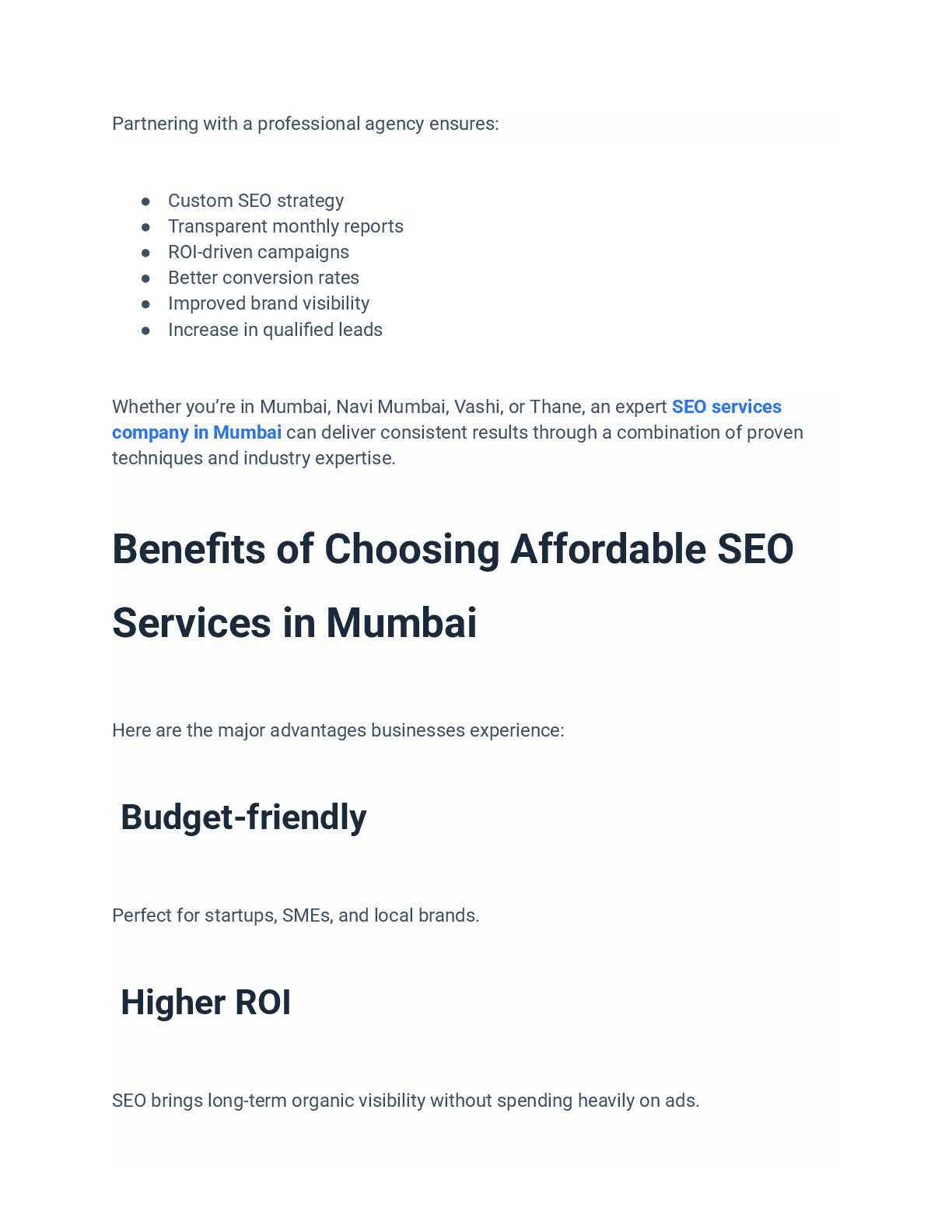 today’s highly competitive digital landscape, every business—whether a startup, local shop, or large enterprise—needs strong online visibility to stay ahead. For brands across Maharashtra, especially in Mumbai and Navi Mumbai, the demand for affordable SEO services in Mumbai has grown rapidly. Companies now look for cost-efficient strategies that deliver long-term organic results without relying heavily on paid ads. This is where professional SEO experts and SEO agencies in Navi Mumbai play a crucial role. By offering data-backed strategies, proven optimization techniques, and measurable results, they help businesses achieve sustainable growth and higher visibility on Google. In this blog, we’ll explore why affordable SEO matters, what proven methods are used by reliable agencies, and how the best SEO company in Navi Mumbai can transform your online presence. Why Affordable SEO Services in Mumbai Are Important Many businesses assume SEO is expensive. But the reality is: effective SEO doesn’t need a massive budget—it needs the right strategy. Affordable SEO helps businesses to: • Reduce marketing costs compared to paid ads • Achieve long-term organic ranking