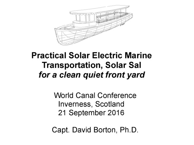 Practical solar electric transportation is now possible, but only with specialized design for marine environments. Solar Sal, a 40 foot wooden solar electric boat, started as a school based project and is now headed to commercial manufacture and use based on a patent pending design.