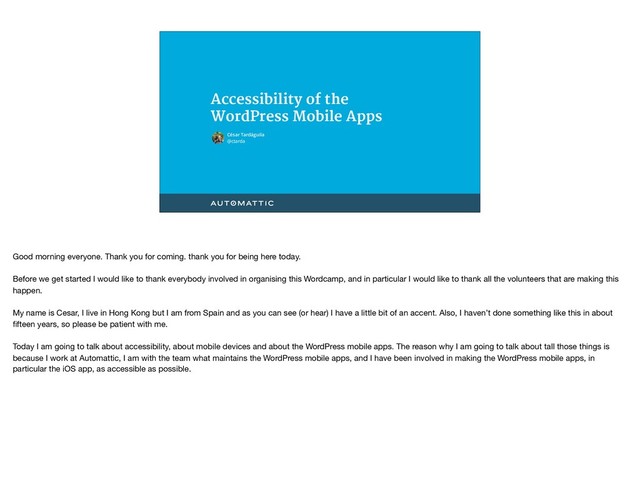 Mobile devices provide an extraordinary opportunity to deliver a superior mobile experience to every user. But still, we, the Mobile Team at Automattic, faced some interesting challenges when we tried to make the WordPress Mobile Apps more accessible. This talk, by one of the developers involved in overcoming some of those challenges, will review the accessibility tools both iOS and Android provide, and will contain first hand information on the way we develop and test the WordPress Mobile Apps, always making accessibility one of our highest priorities, to make sure that we provide the experience that our users expect.