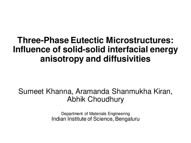 associated solid-solid interfacial anisotropy even in three-phase eutectics, you can find more information here: • Quasi-isotropic and locked grain growth dynamics in a three-phase eutectic system Samira Mohagheghi, Melis Serefoglu; Acta Materialia 151 (2018) 432e442 • Effects of interphase boundary anisotropy on the three-phase growthdynamics in the β(In) – In2Bi – γ(Sn) ternary-eutectic system; S Mohagheghi, U Hecht, S Bottin-Rousseau, S Akamatsu, G Faivre3, M Şerefoğlu1 IOP Conf. Series: Materials Science and Engineering 529 (2019) 012010